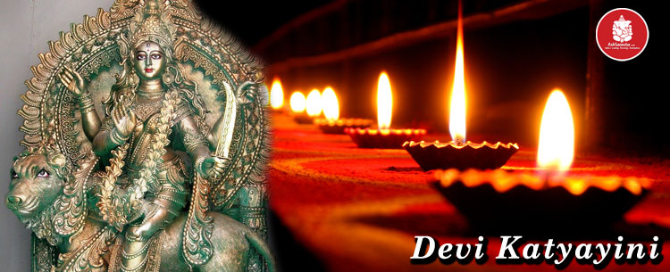 The sixth Manifestation of Godess Parvati is Goddess Katyayani, she has a shield, a sword and a lotus flower in her three hands and the fourth hand is in the blessing pose., mounted on a ferocious Lion, she is considered one of the violent avtar of Goddess Parvati. She was the slayer of Mahishasura. She governs the planet of Brahaspati.
