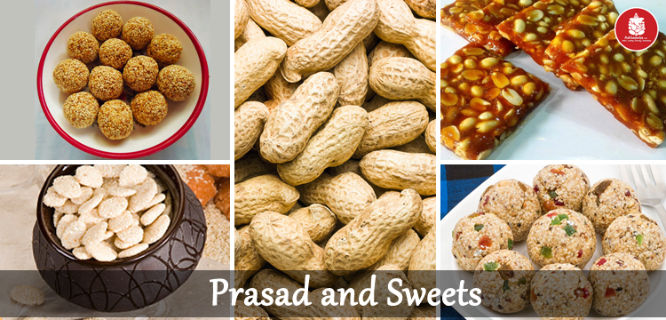 The sweets are made from sesame seeds and jaggery which include rewari and gajak and they are put into the fire, as offerings to the Fire God. Other offerings made include moongphali or peanuts and popcorn. These foods are distributed during the celebration to people who attend the festivities as prasadam. The Lohri feast is prepared using ingredients from winter crops including sugarcane, radish, mustard greens and groundnuts. The dishes which are traditionally prepared during Lohri include makki ki roti and sarso ka saag which is a spicy Indian preparation made from mustard greens). The 2 dishes are served together, with whole jaggery or powdered jaggery and/or homemade butter made from cow's milk as garnishing. Another traditional dish of the harvest festival is the til bhaat commonly known as sesame rice that is rice made with jaggery and sesame seeds.