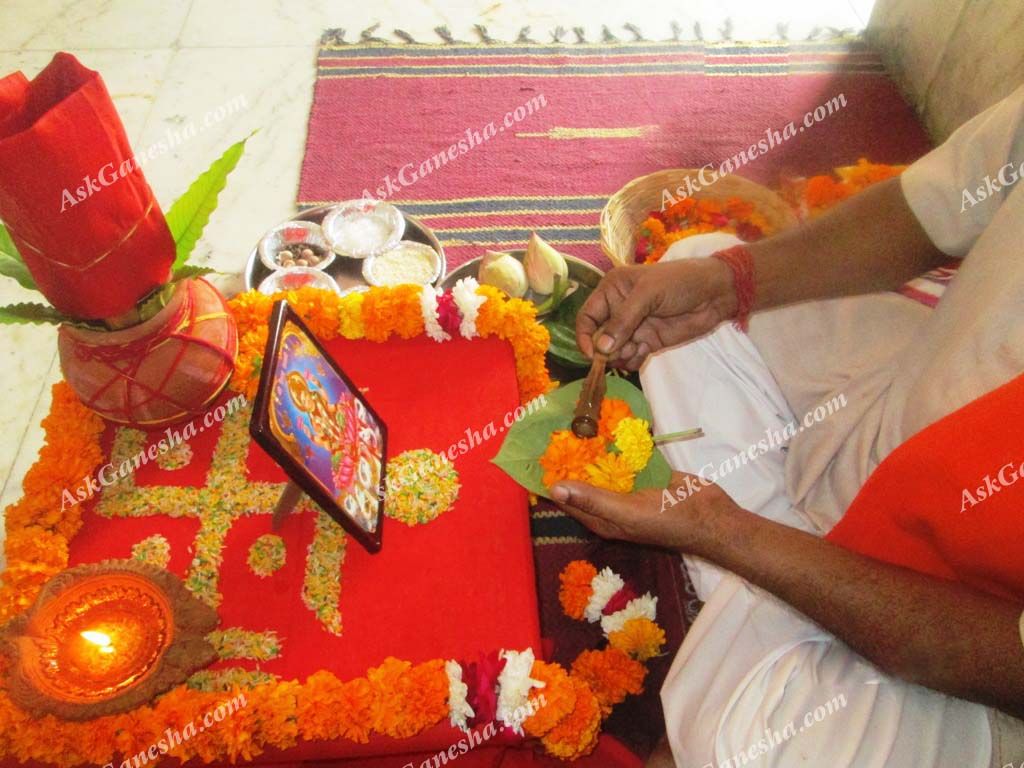 This is an aesthetic step which brings us closer to the yagya. In this procedure, the priests and the attendees offer flowers to the dieties’ statues or photographs. Offering flowers in the feet of the Gods/Goddesses is a kind of showing affection and respect towards them. It is an act of pleasing the deities.