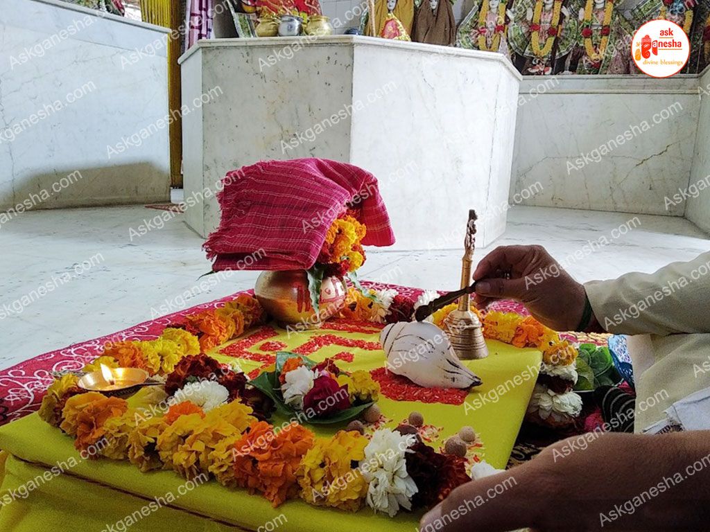 This is an aesthetic step which brings us closer to the yagya. In this procedure, the priests and the attendees offer flowers to the dieties’ statues or photographs. Offering flowers in the feet of the Gods/Goddesses is a kind of showing affection and respect towards them. It is an act of pleasing the deities.