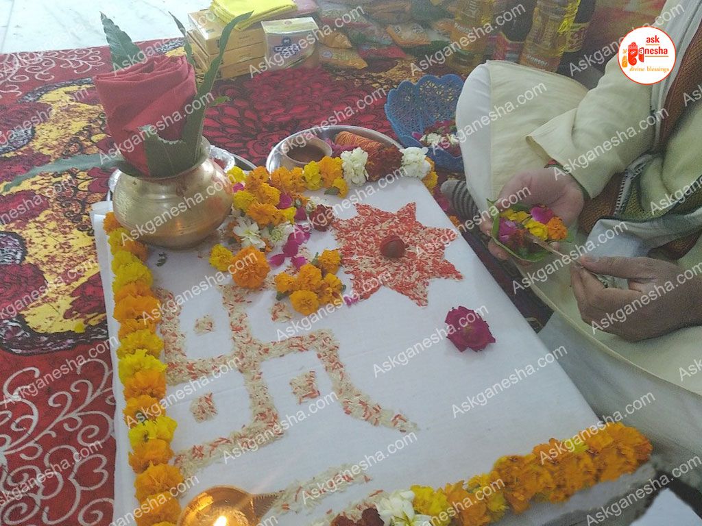 This is an aesthetic step which brings us closer to the yagya. In this procedure, the priests and the attendees offer flowers to the dieties’ statues or photographs. Offering flowers in the feet of the Gods/Goddesses is a kind of showing affection and respect towards them. It is an act of pleasing the deities.