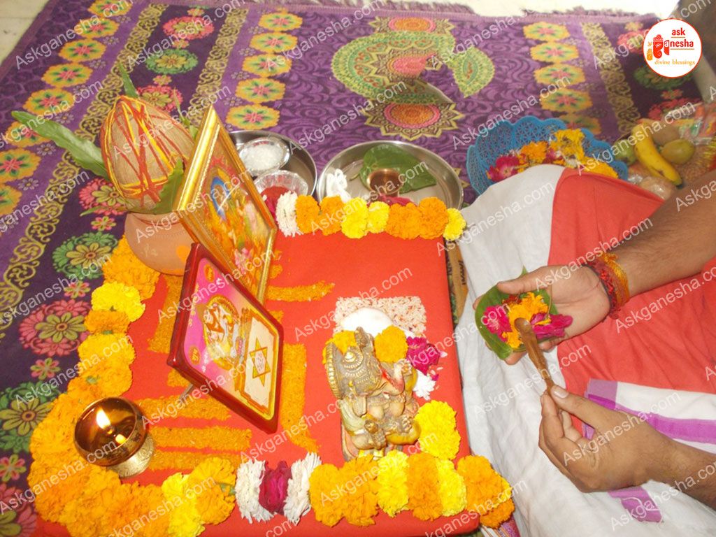 The pooja begins with the chanting of Ganapati Mantras and praying him to shower his blessings on his devotees. Thereafter the purpose of commencing the puja is stated to invoke the blessings of Goddess Lakshmi, Lord Kuber, and Lord Vishnu. The puja of these 4 deities is performed for invoking their blessings to bring in loads of fortune to the respective devotees. These prayers are performed for seeking divine blessings for prosperity and happiness of all the members of the family. Any special prayers you have are added too.