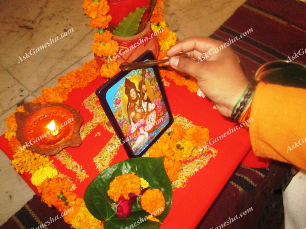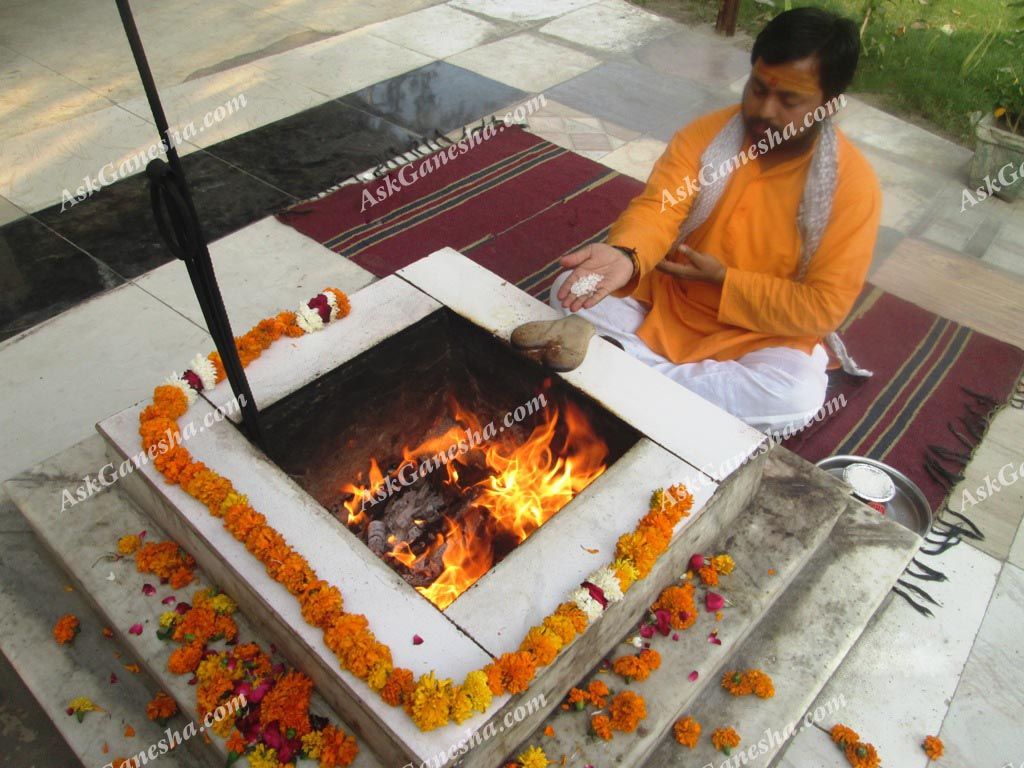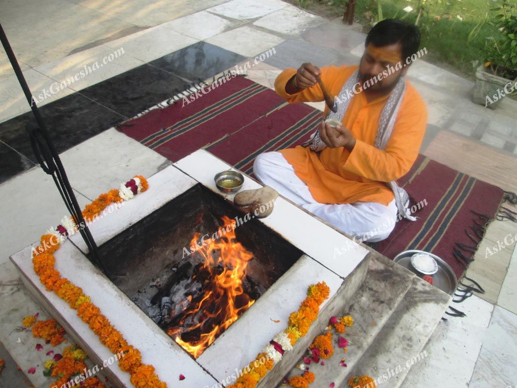 This is an aesthetic step which brings us closer to the yagya. In this procedure, the priests and the attendees offer flowers to the dieties’ statues or photographs. Offering flowers in the feet of the Gods/Goddesses is a kind of showing affection and respect towards them. It is an act of pleasing the deities.