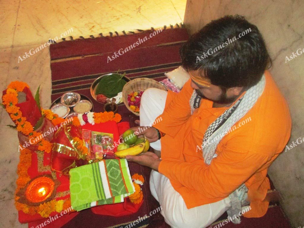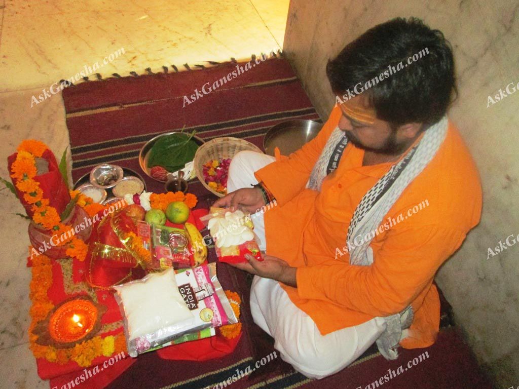 In this step, the priests offers the deities, some kind of sweets and fruits in the form of Prasad which is distributed among the members participating in the yagya at the end of Pooja/Yagya. Usually Prasad can be in form of ‘chappan bhog’ meaning 56 different kinds of sweet and salty eatables that the deities are known to relish.