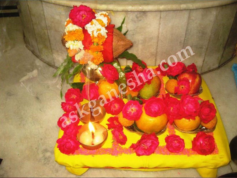 This is an aesthetic step which brings us closer to the yagya. In this procedure, the priests and the attendees offer flowers to the dieties’ statues or photographs. Offering flowers in the feet of the Gods/Goddesses is a kind of showing affection and respect towards them. It is an act of pleasing the deities.
