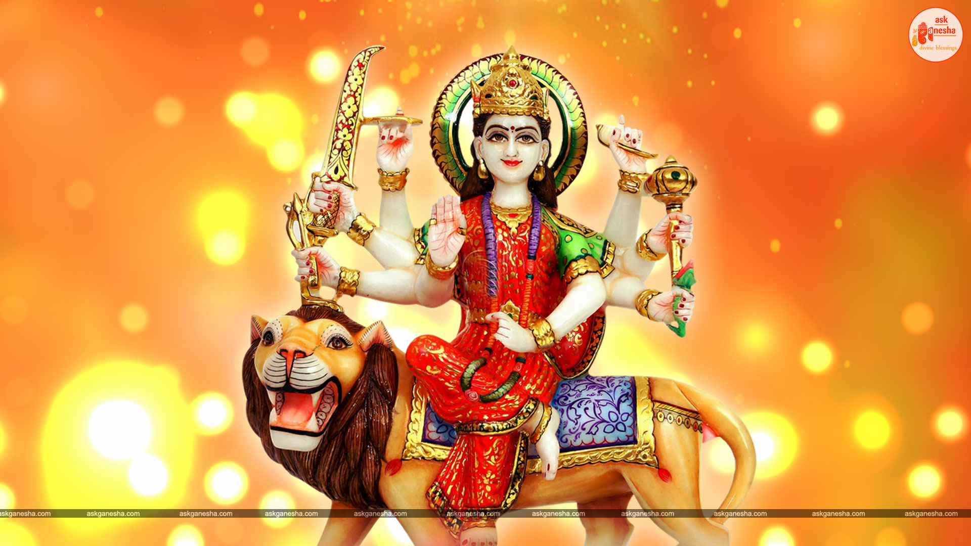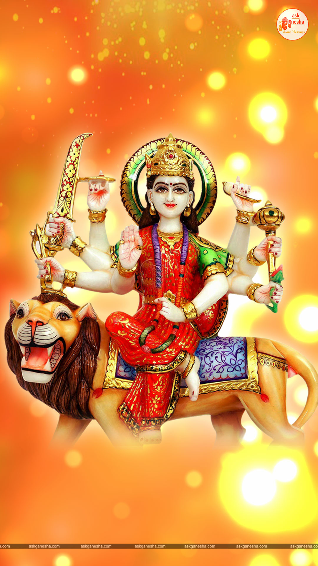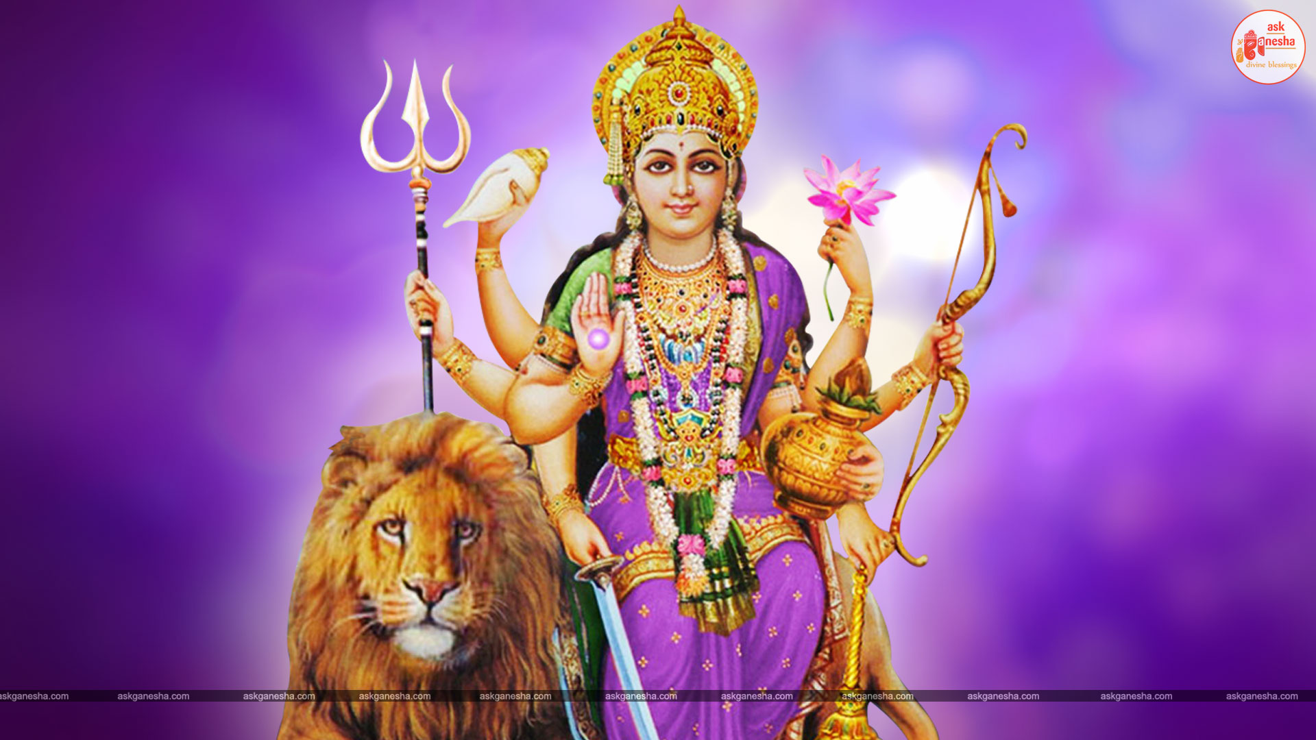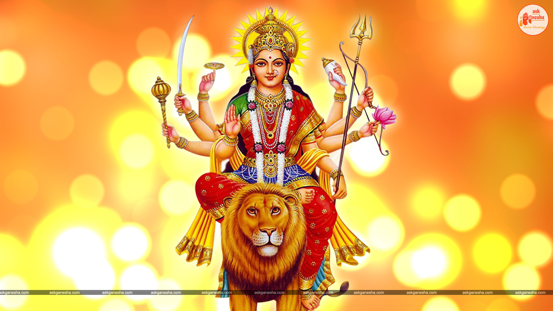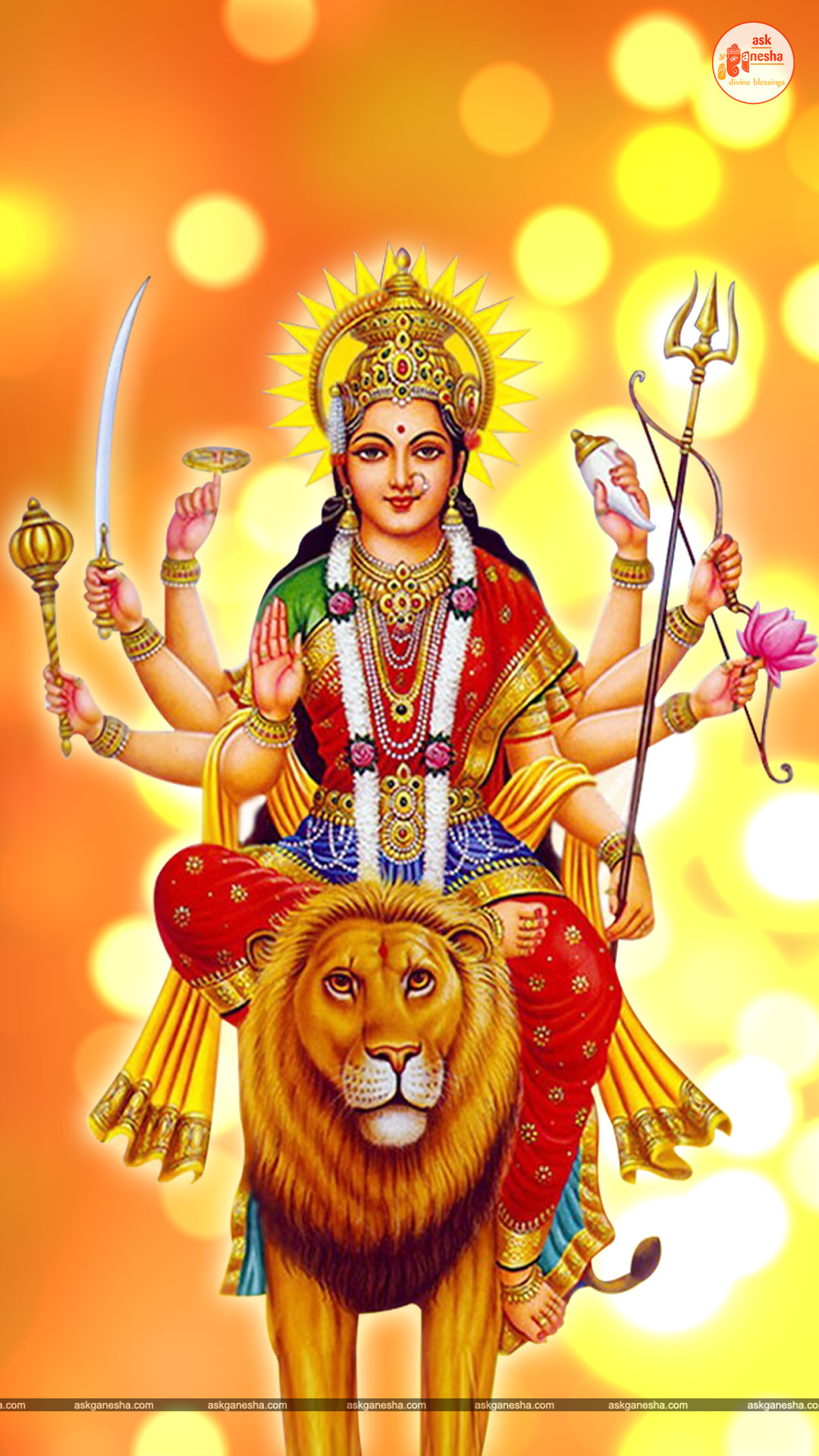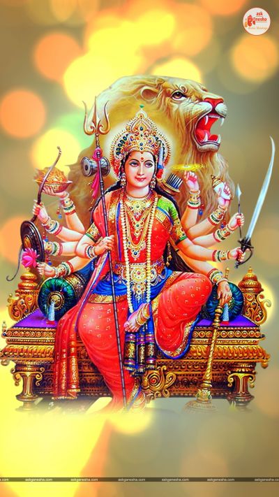 Askganesha has brought some beautiful remedial wallpapers of Maa Durga for you to be installed on your electronic gadgets for your daily darshan and prayer. You can have the darshan of Goddess Durga at any time of the day and can say your prayers to her. The benevolent mother will certainly listen to your prayers and will fulfil your wishes. Every time you operate your mobile or the laptop, you will have an opportunity to have her Darshan. You can bow to her and plead to her for your success and protection. As Durga will accompany you everywhere, you will be safe from your enemies and other negative and evil forces. No danger or mishappening can cause harm to you as long as she is with you. No hurdle can stop you from reaching your destination of success with Mother being with you with her divine and graceful presence. You will be saved from sorrows and miseries of life and the positivity of Divine mother's divine presence will grant you peace and happiness in life.