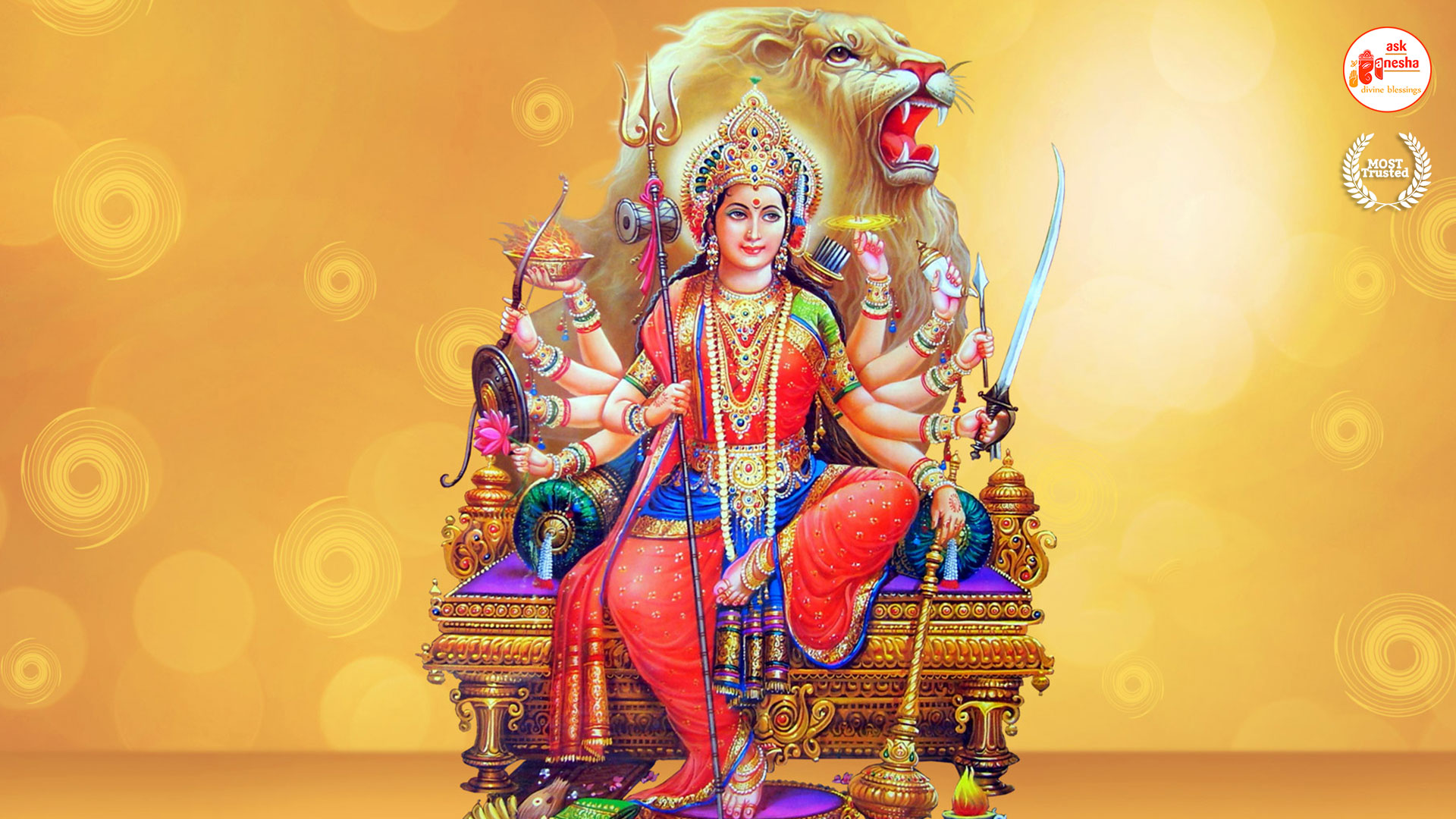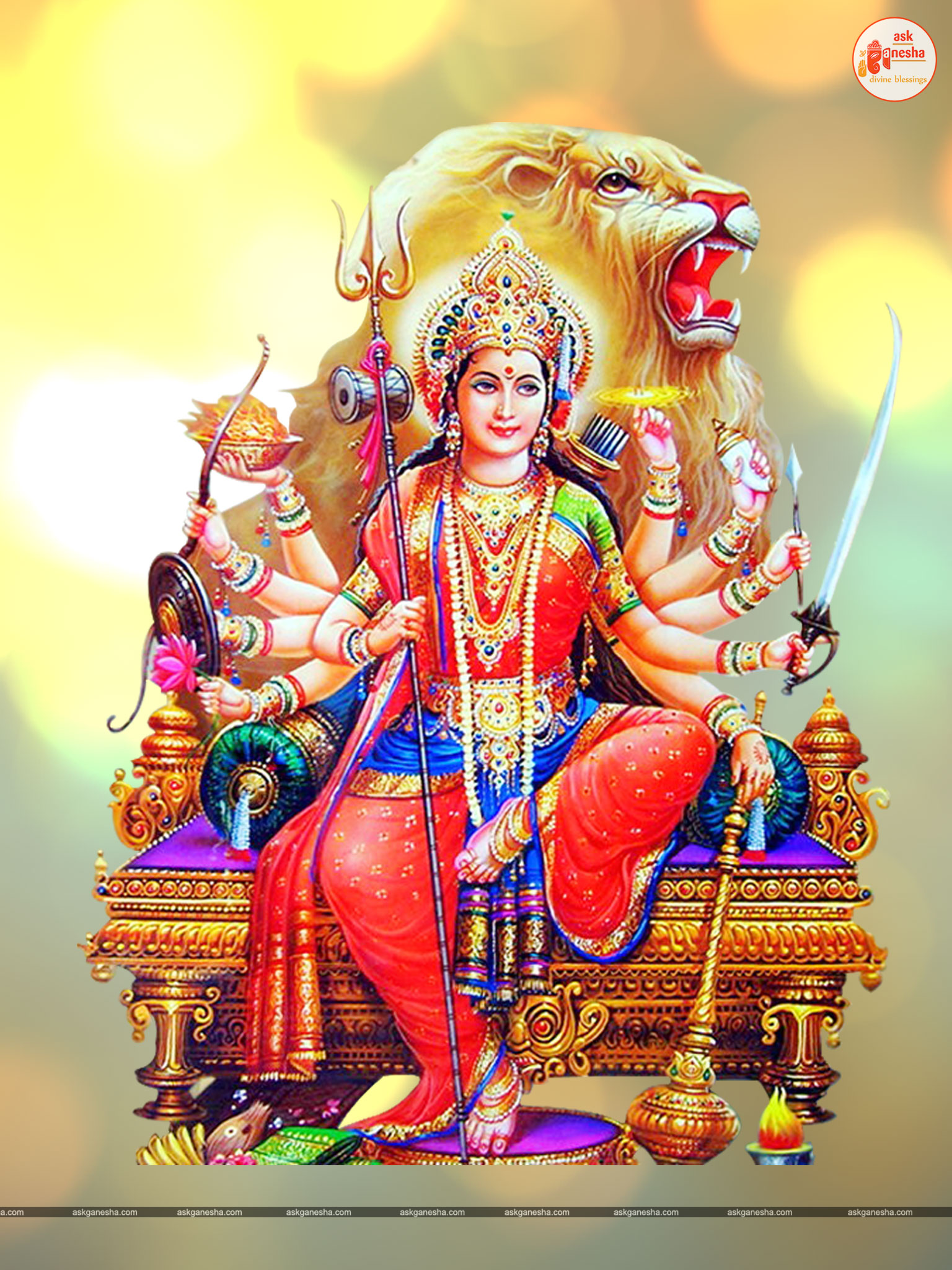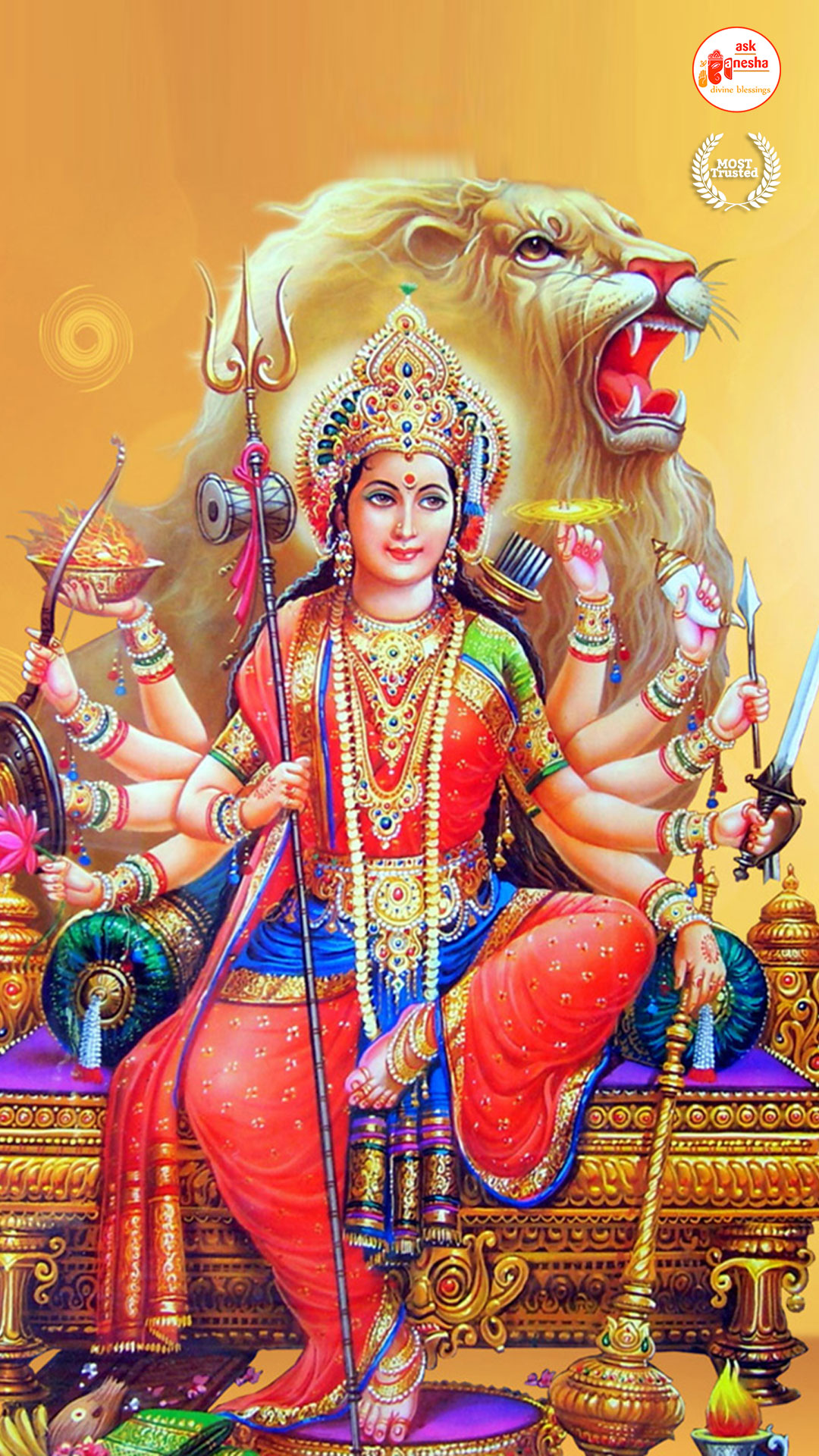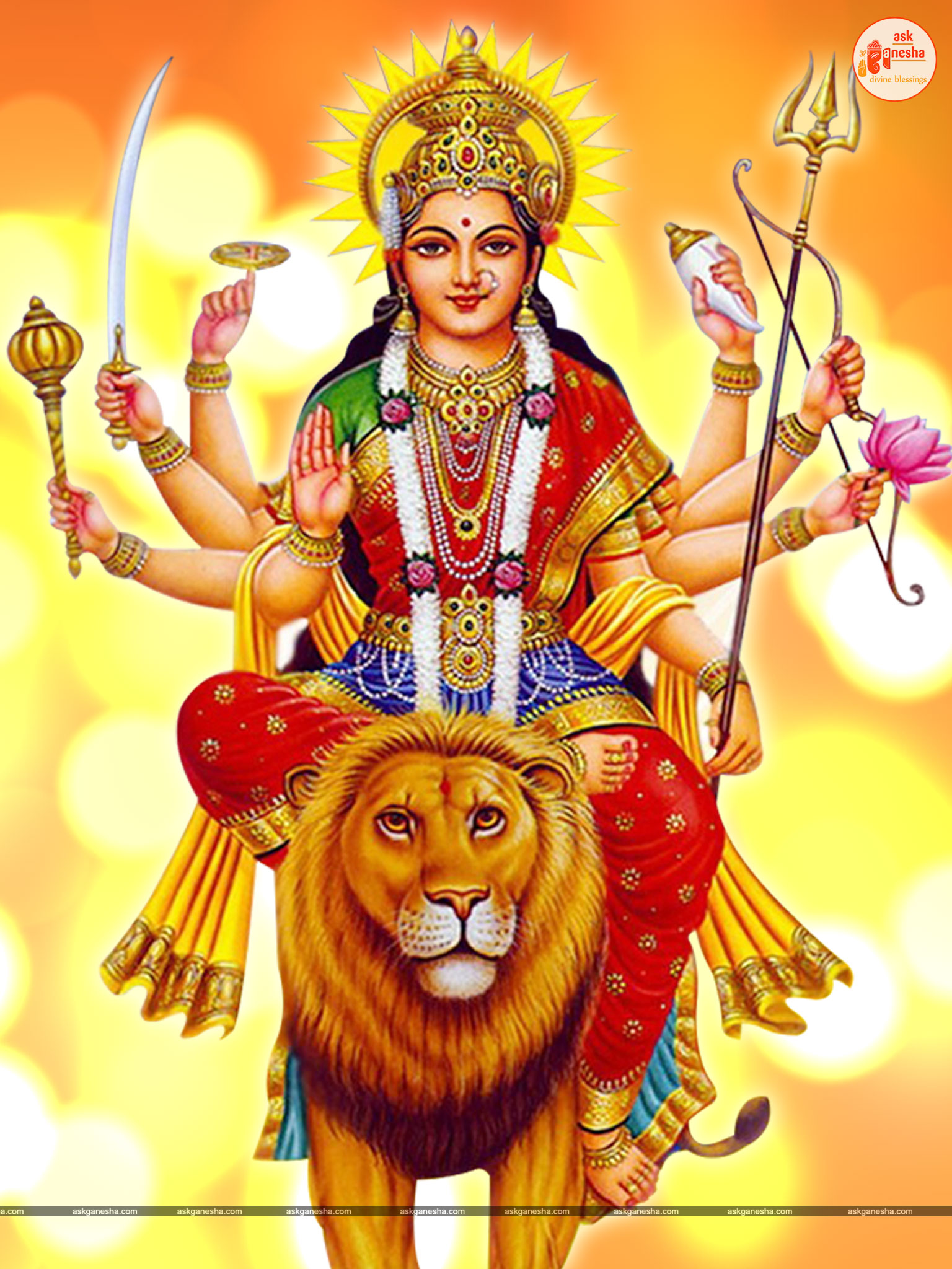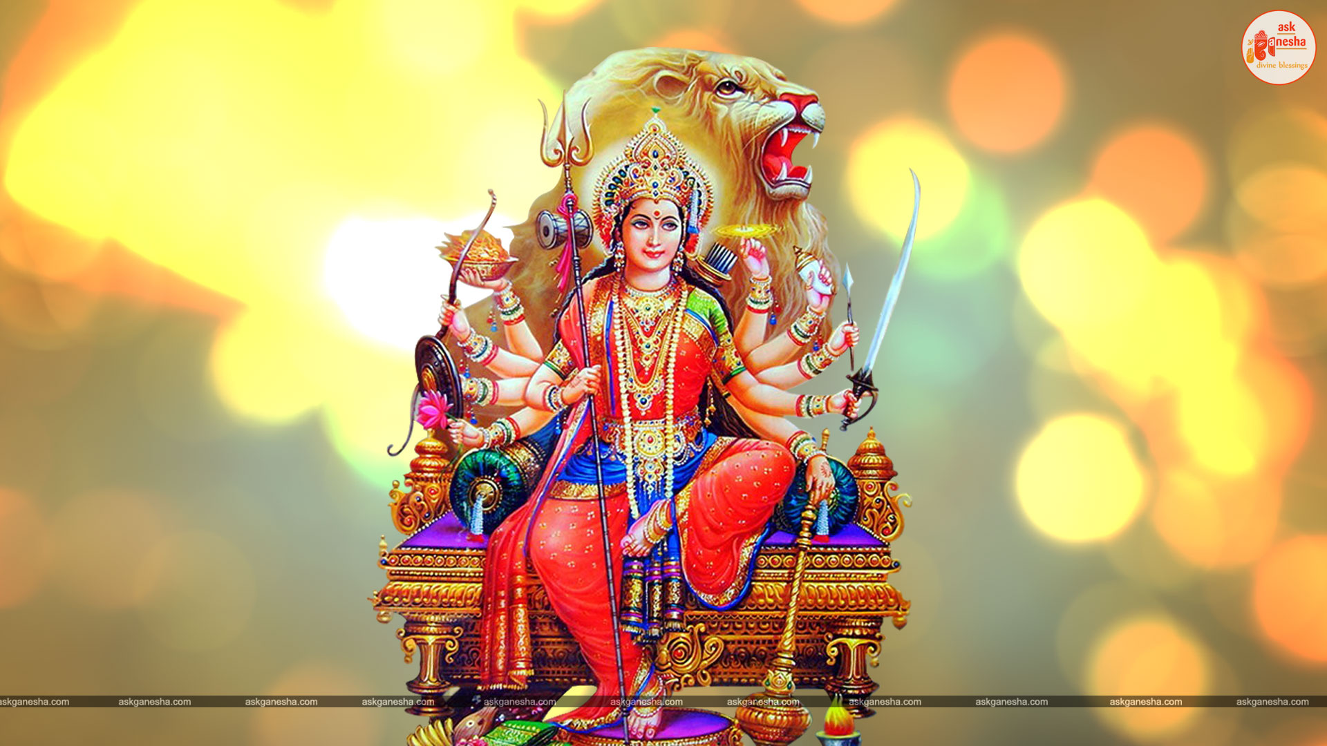 Askganesha has brought some beautiful remedial wallpapers of Maa Durga for you to be installed on your electronic gadgets for your daily darshan and prayer. You can have the darshan of Goddess Durga at any time of the day and can say your prayers to her. The benevolent mother will certainly listen to your prayers and will fulfil your wishes. Every time you operate your mobile or the laptop, you will have an opportunity to have her Darshan. You can bow to her and plead to her for your success and protection. As Durga will accompany you everywhere, you will be safe from your enemies and other negative and evil forces. No danger or mishappening can cause harm to you as long as she is with you. No hurdle can stop you from reaching your destination of success with Mother being with you with her divine and graceful presence. You will be saved from sorrows and miseries of life and the positivity of Divine mother's divine presence will grant you peace and happiness in life.