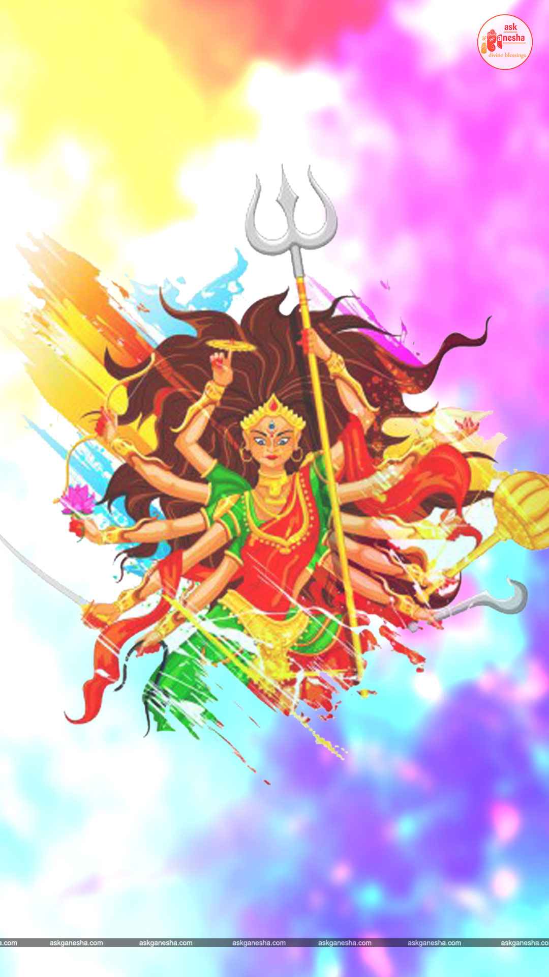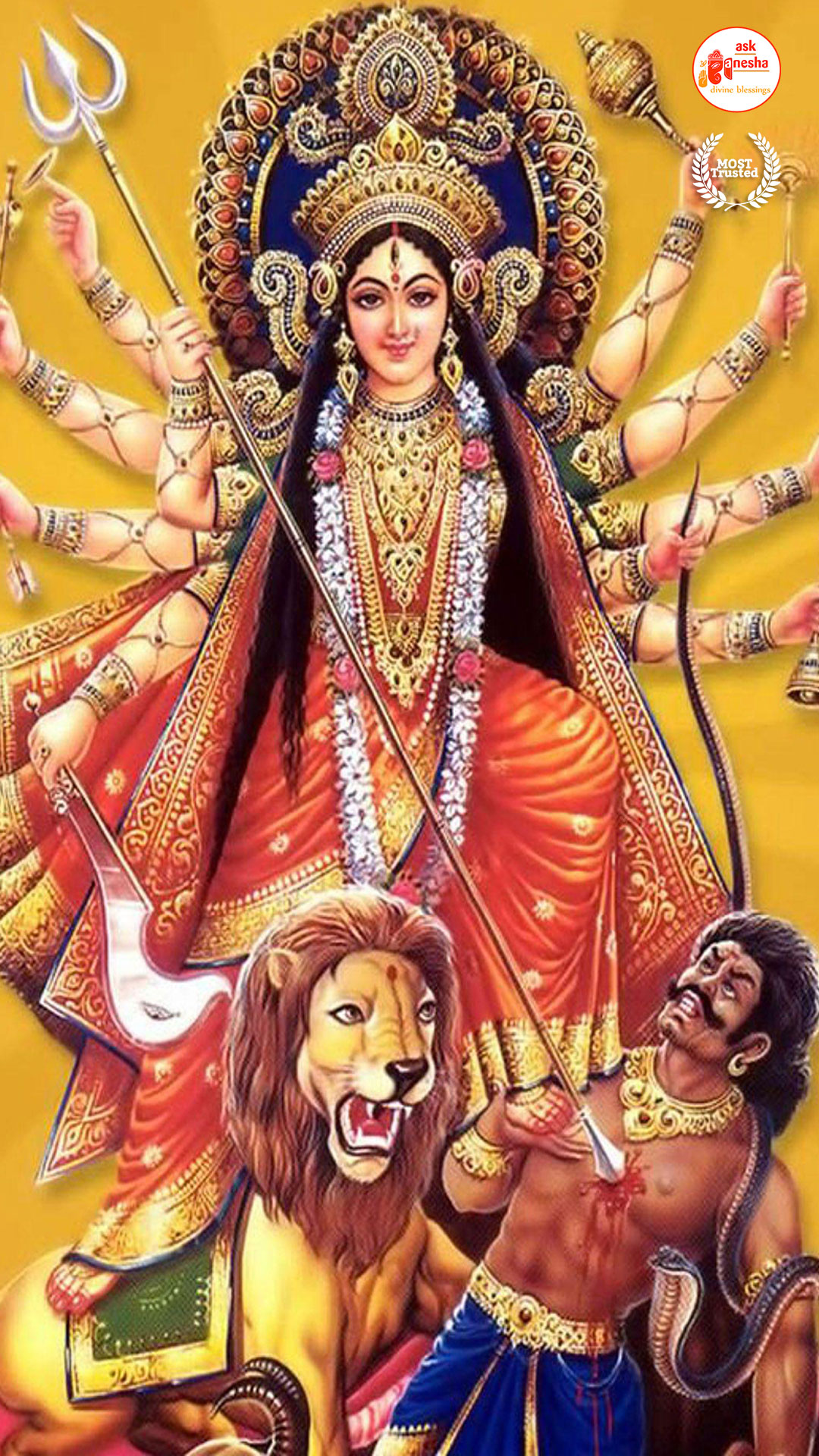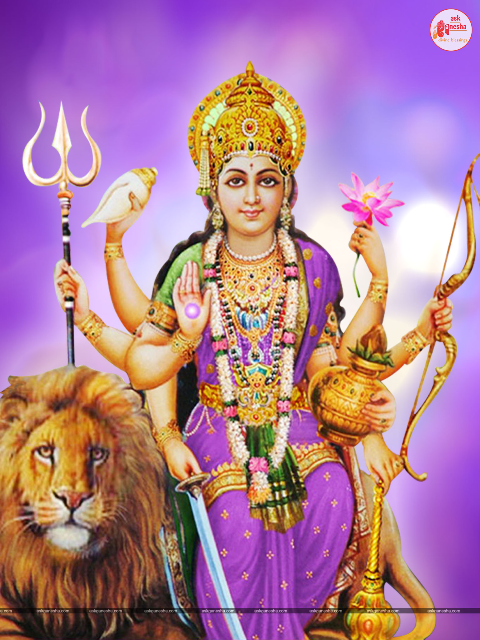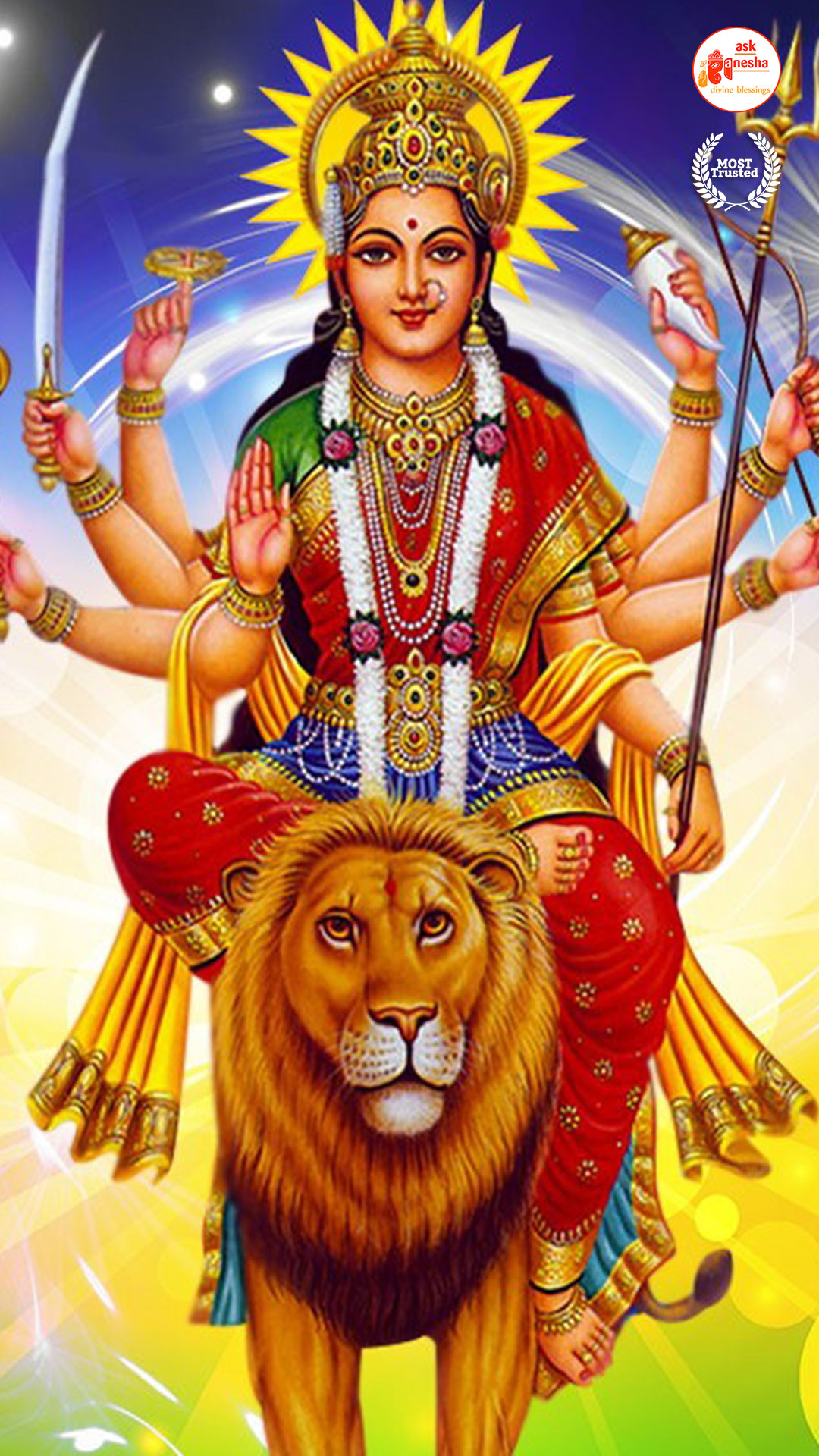 Askganesha has brought some beautiful remedial wallpapers of Maa Durga for you to be installed on your electronic gadgets for your daily darshan and prayer. You can have the darshan of Goddess Durga at any time of the day and can say your prayers to her. The benevolent mother will certainly listen to your prayers and will fulfil your wishes. Every time you operate your mobile or the laptop, you will have an opportunity to have her Darshan. You can bow to her and plead to her for your success and protection. As Durga will accompany you everywhere, you will be safe from your enemies and other negative and evil forces. No danger or mishappening can cause harm to you as long as she is with you. No hurdle can stop you from reaching your destination of success with Mother being with you with her divine and graceful presence. You will be saved from sorrows and miseries of life and the positivity of Divine mother's divine presence will grant you peace and happiness in life.
