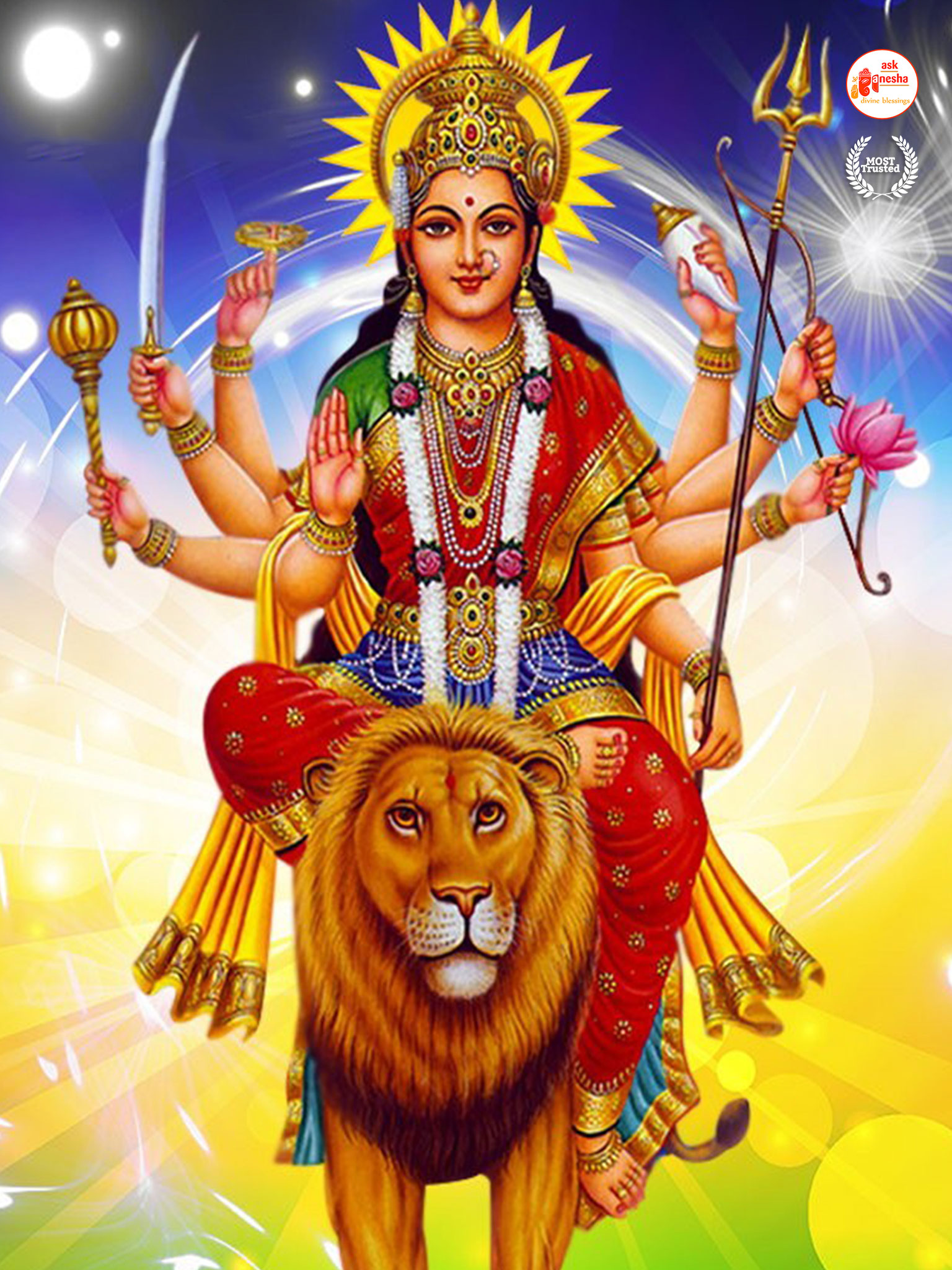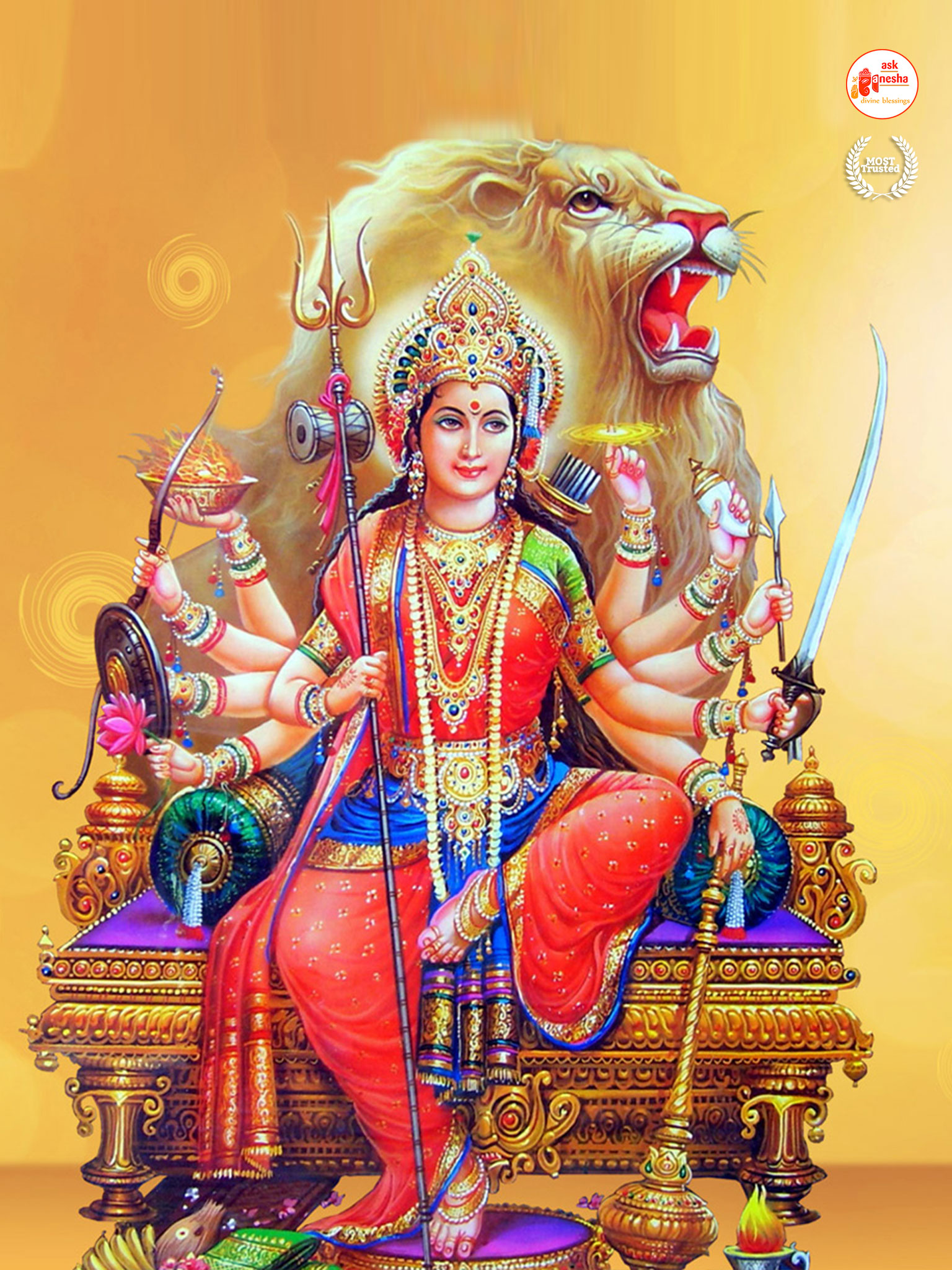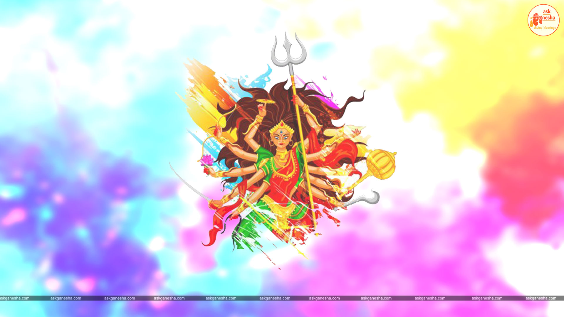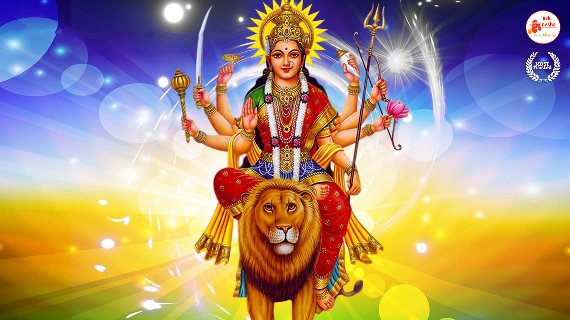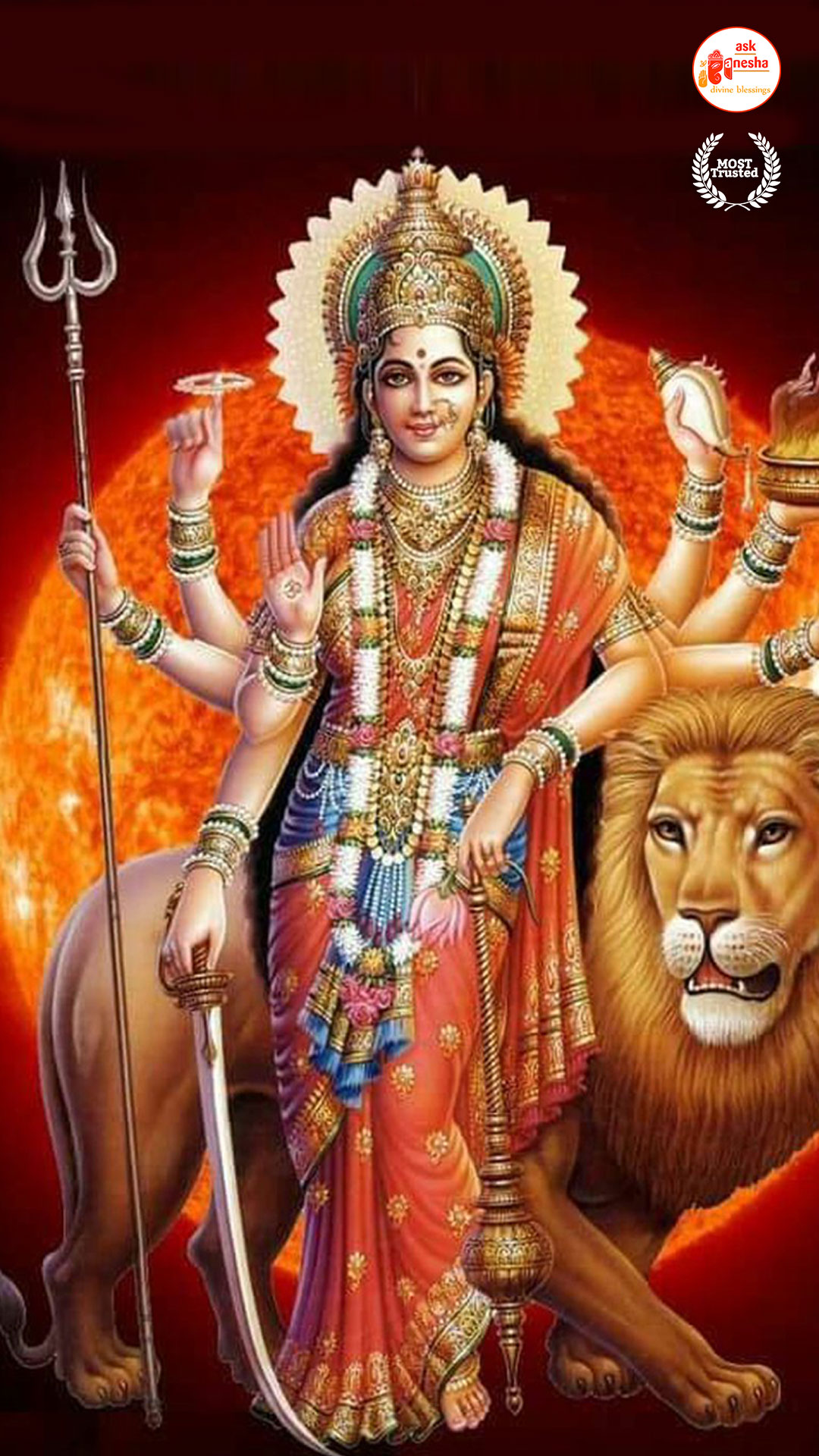 Askganesha has brought some beautiful remedial wallpapers of Maa Durga for you to be installed on your electronic gadgets for your daily darshan and prayer. You can have the darshan of Goddess Durga at any time of the day and can say your prayers to her. The benevolent mother will certainly listen to your prayers and will fulfil your wishes. Every time you operate your mobile or the laptop, you will have an opportunity to have her Darshan. You can bow to her and plead to her for your success and protection. As Durga will accompany you everywhere, you will be safe from your enemies and other negative and evil forces. No danger or mishappening can cause harm to you as long as she is with you. No hurdle can stop you from reaching your destination of success with Mother being with you with her divine and graceful presence. You will be saved from sorrows and miseries of life and the positivity of Divine mother's divine presence will grant you peace and happiness in life.