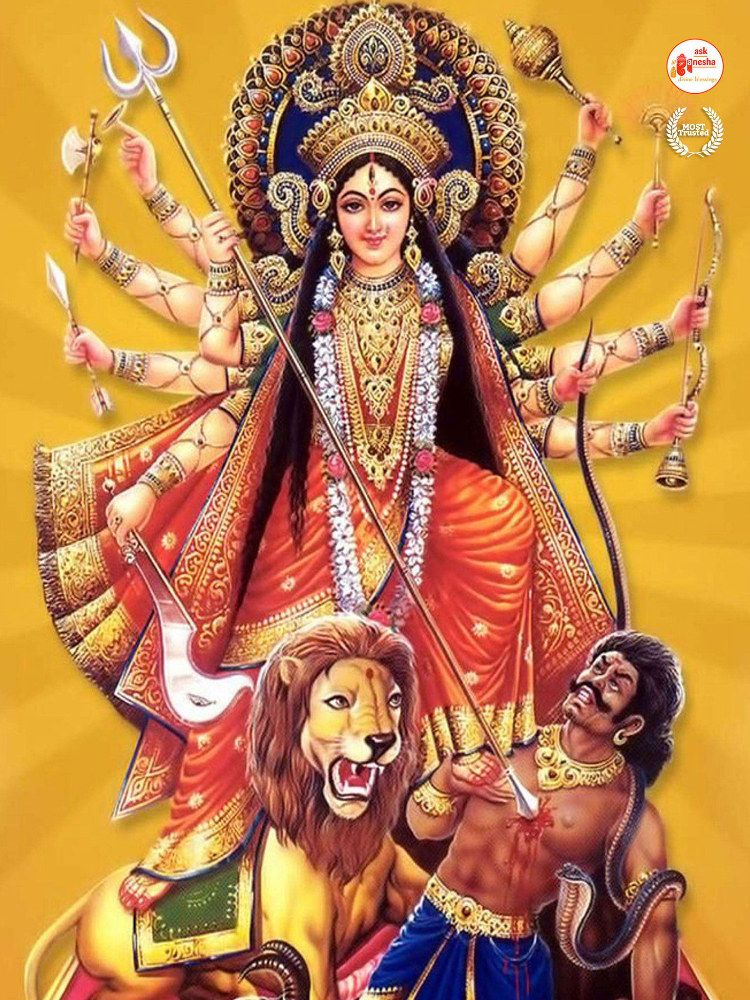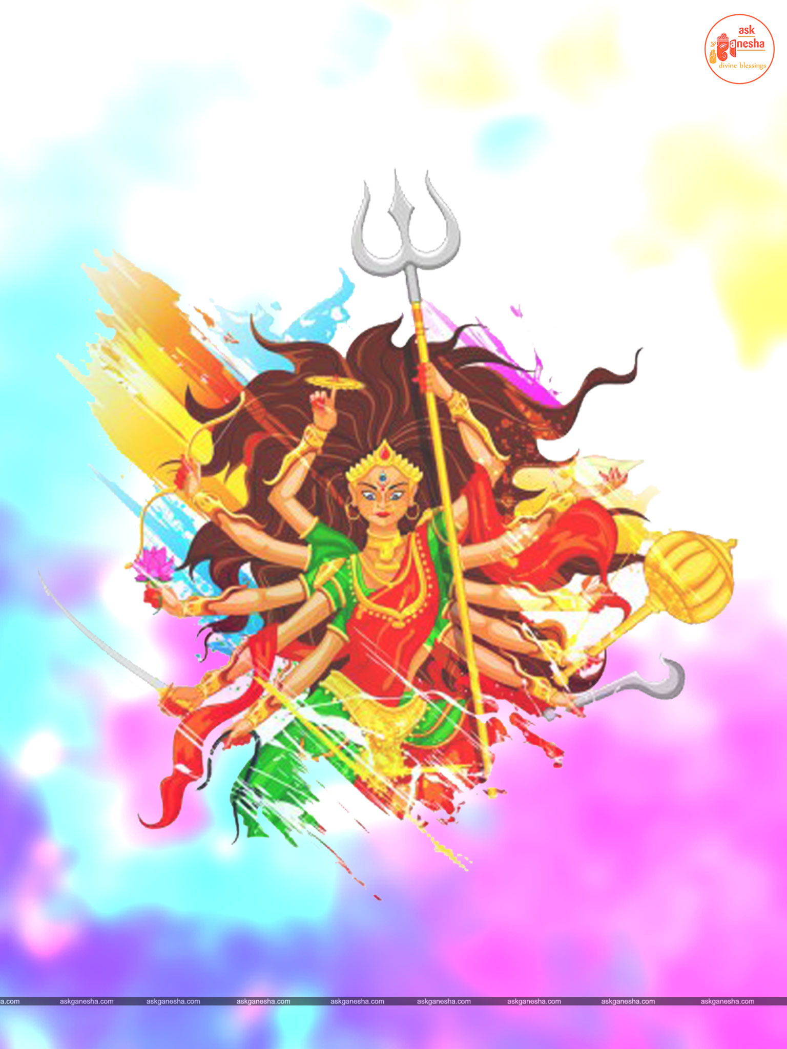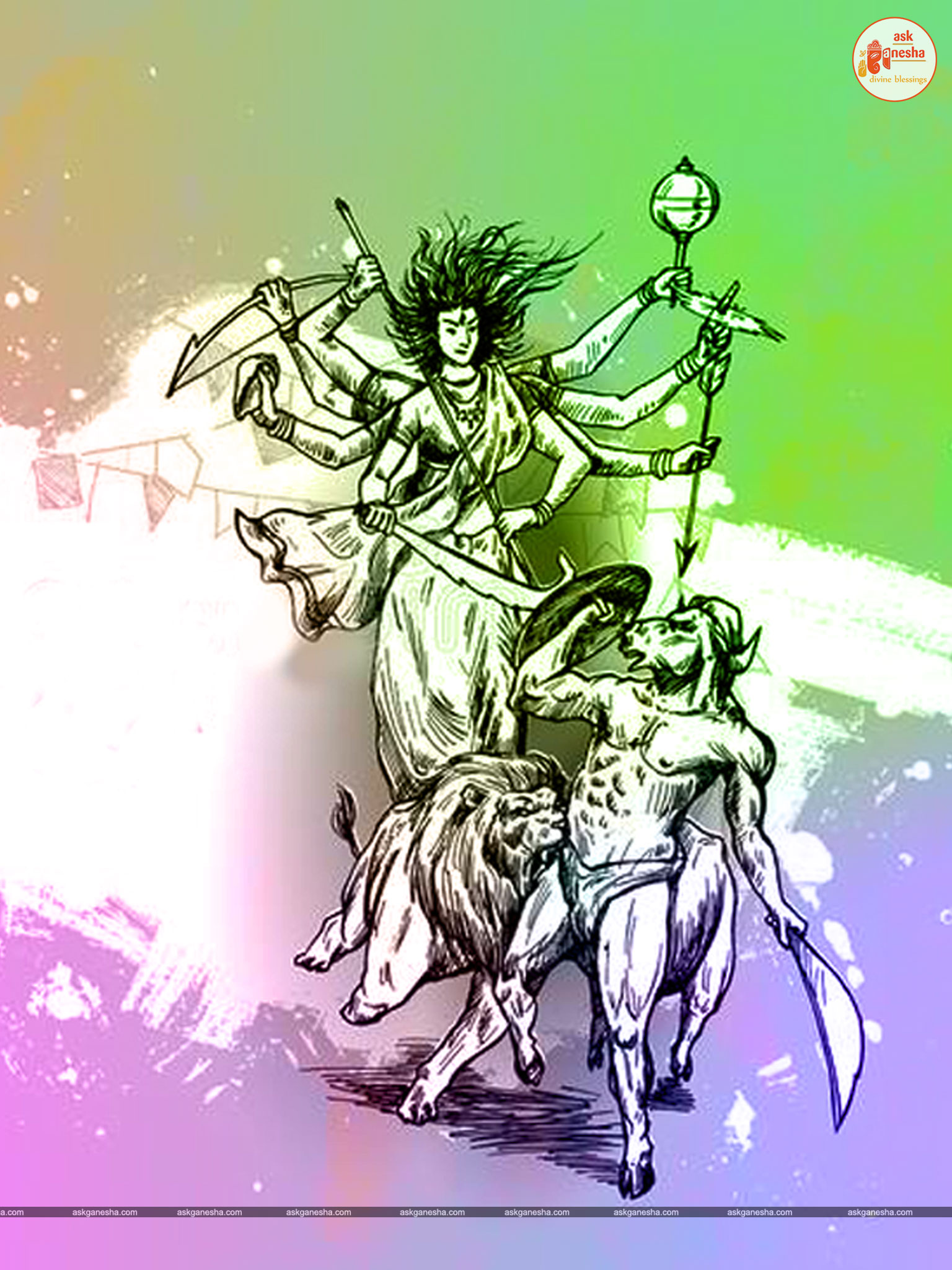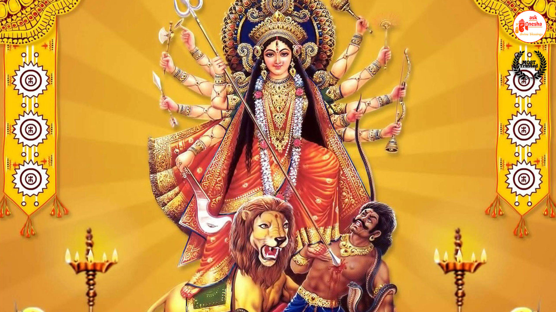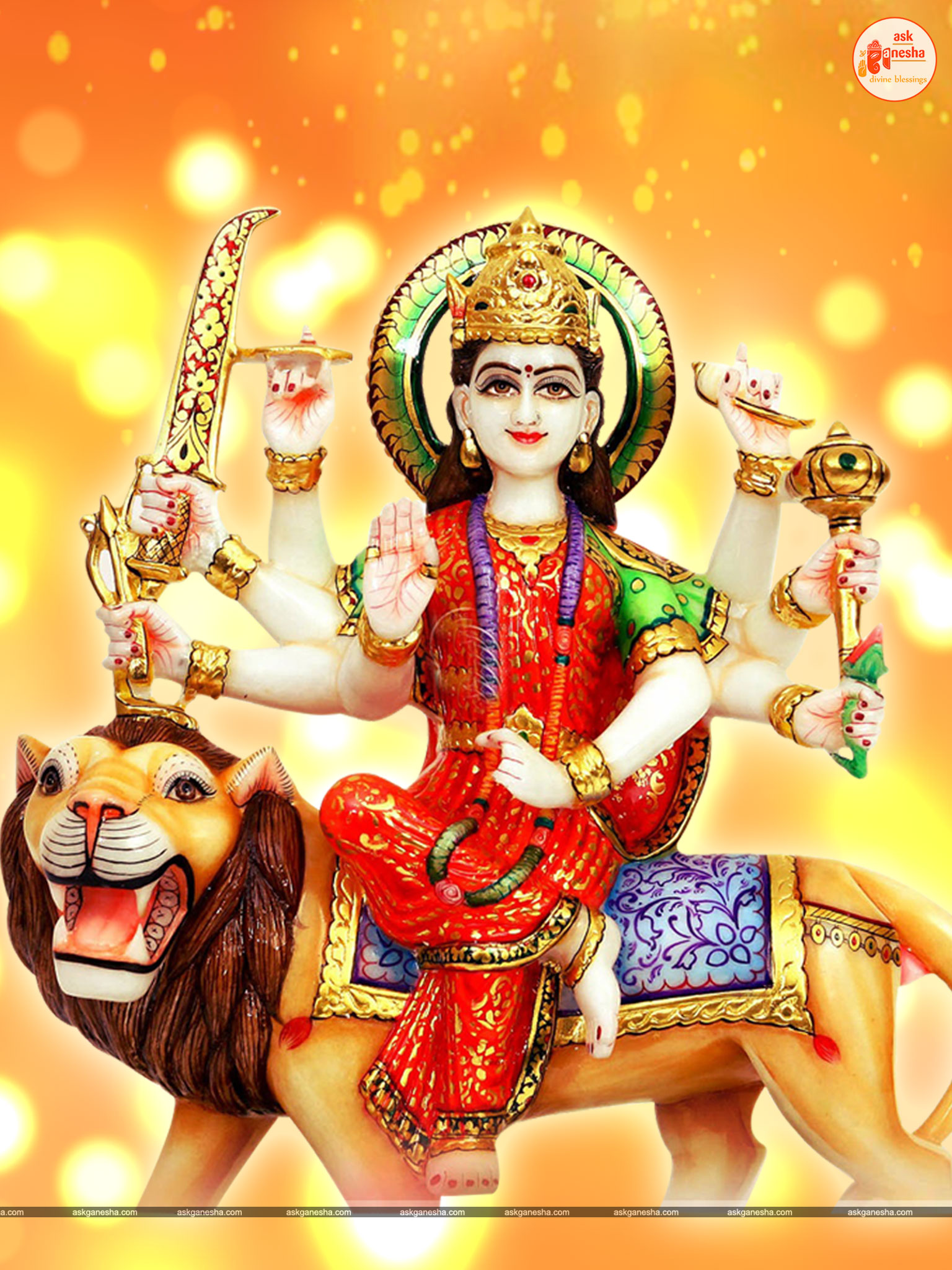Askganesha has brought some beautiful remedial wallpapers of Maa Durga for you to be installed on your electronic gadgets for your daily darshan and prayer. You can have the darshan of Goddess Durga at any time of the day and can say your prayers to her. The benevolent mother will certainly listen to your prayers and will fulfil your wishes. Every time you operate your mobile or the laptop, you will have an opportunity to have her Darshan. You can bow to her and plead to her for your success and protection. As Durga will accompany you everywhere, you will be safe from your enemies and other negative and evil forces. No danger or mishappening can cause harm to you as long as she is with you. No hurdle can stop you from reaching your destination of success with Mother being with you with her divine and graceful presence. You will be saved from sorrows and miseries of life and the positivity of Divine mother's divine presence will grant you peace and happiness in life.