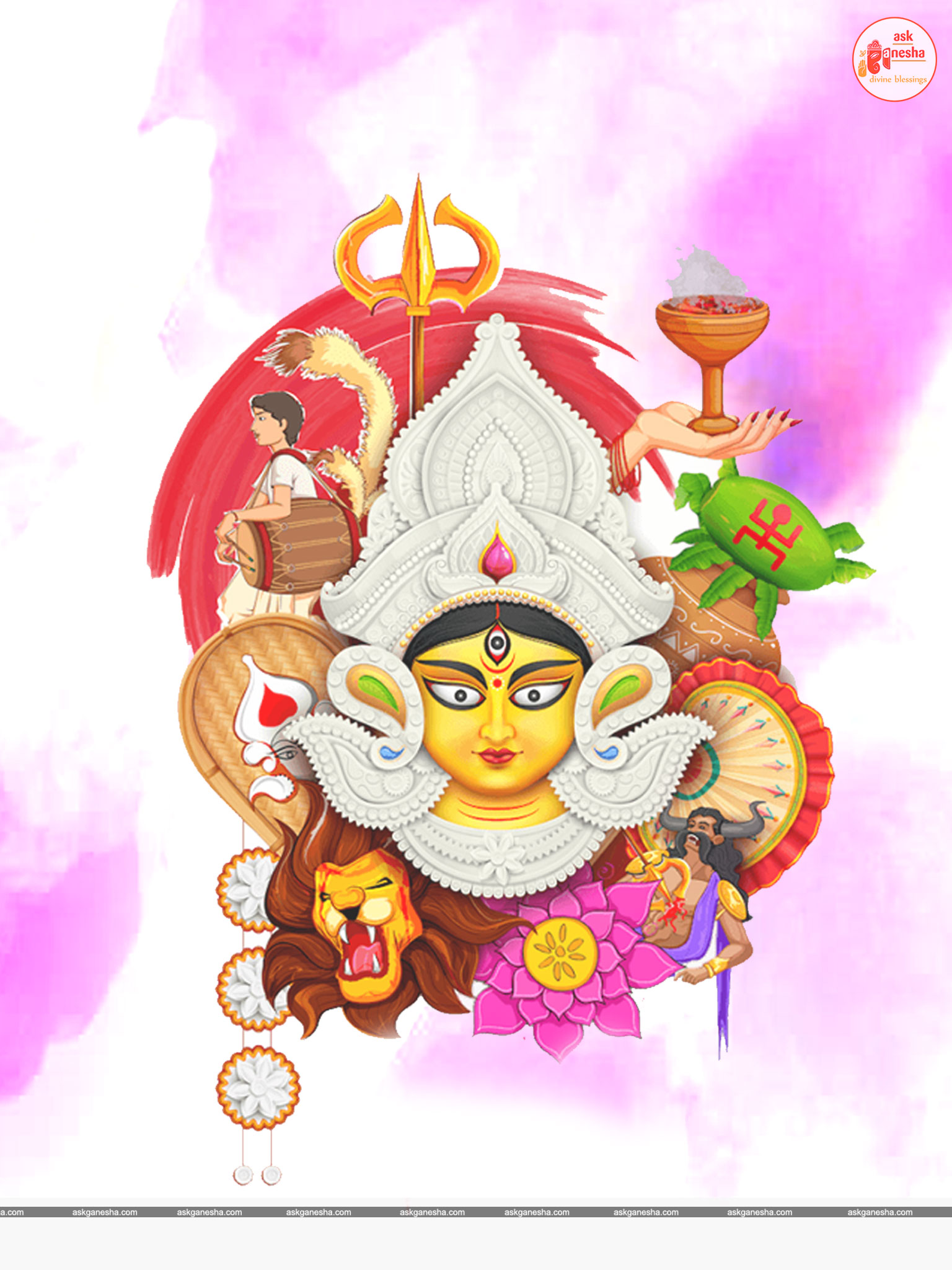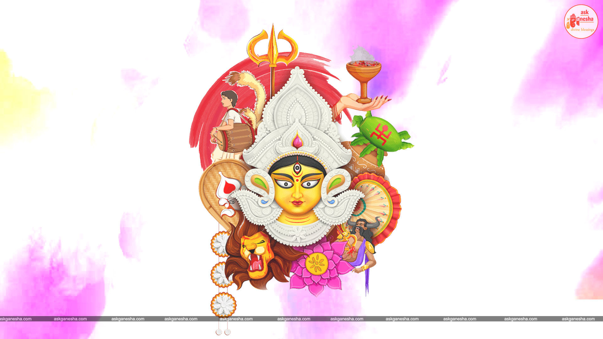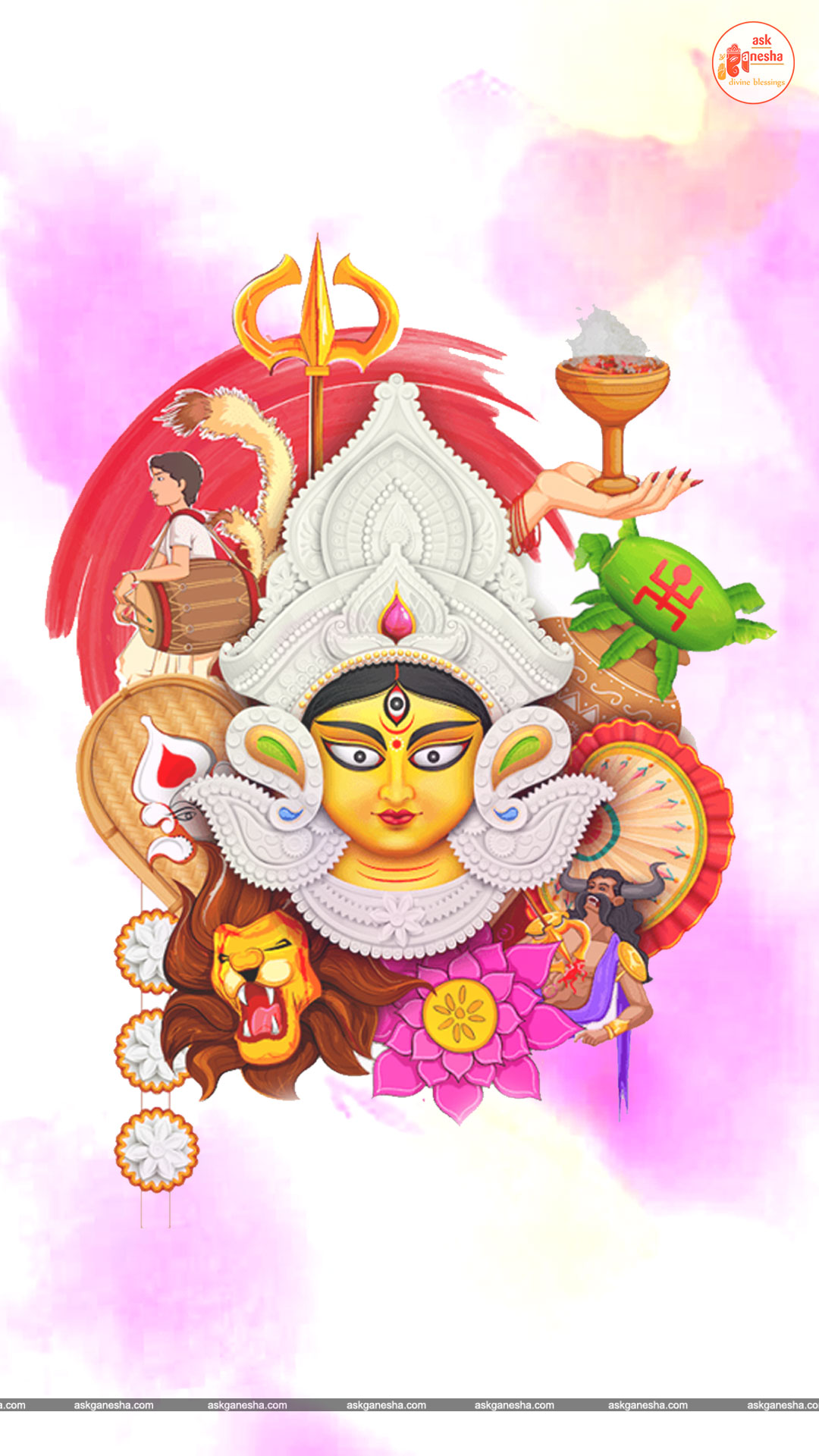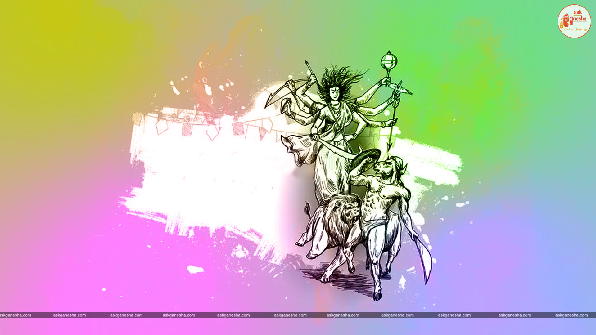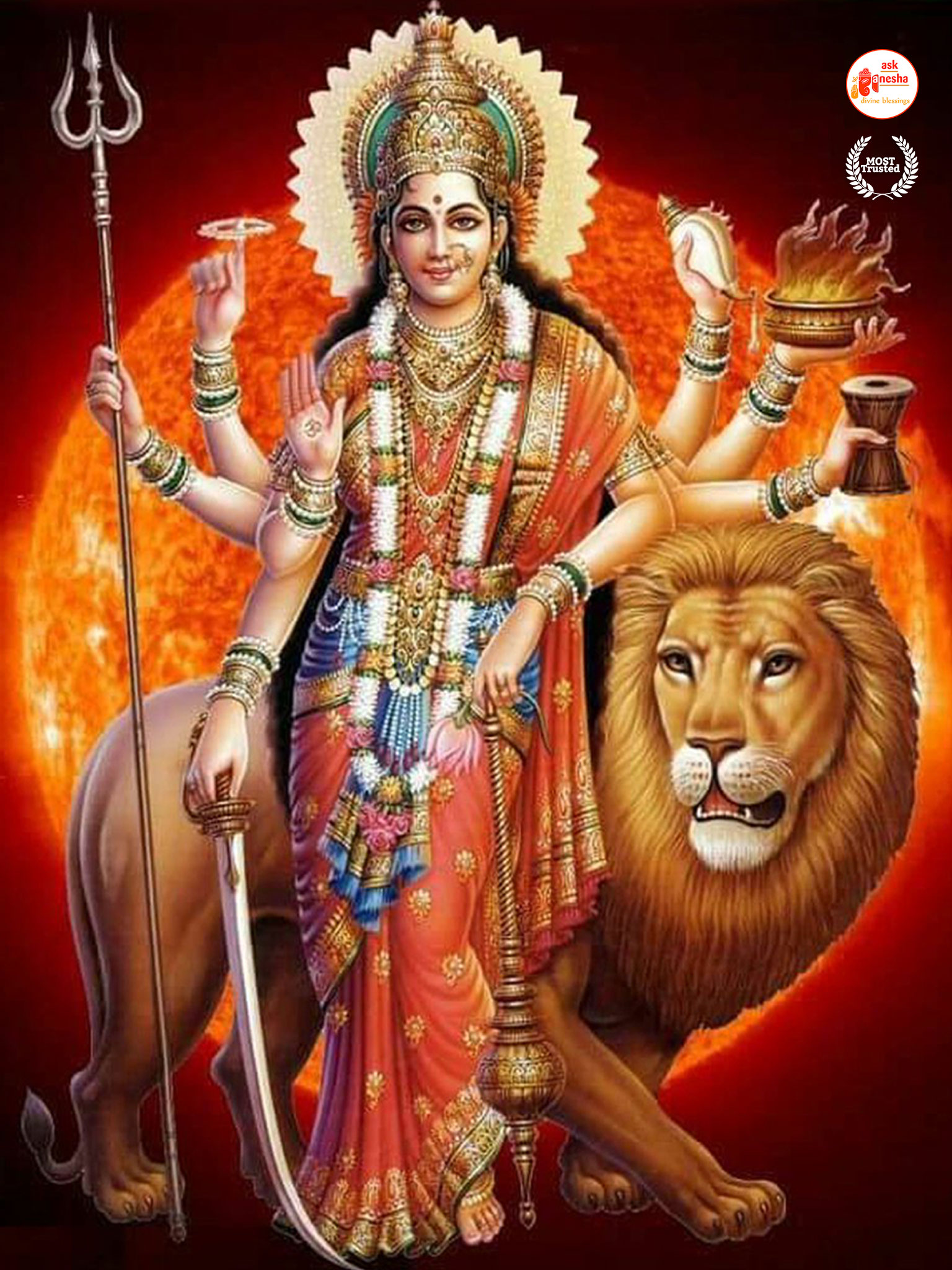 Askganesha has brought some beautiful remedial wallpapers of Maa Durga for you to be installed on your electronic gadgets for your daily darshan and prayer. You can have the darshan of Goddess Durga at any time of the day and can say your prayers to her. The benevolent mother will certainly listen to your prayers and will fulfil your wishes. Every time you operate your mobile or the laptop, you will have an opportunity to have her Darshan. You can bow to her and plead to her for your success and protection. As Durga will accompany you everywhere, you will be safe from your enemies and other negative and evil forces. No danger or mishappening can cause harm to you as long as she is with you. No hurdle can stop you from reaching your destination of success with Mother being with you with her divine and graceful presence. You will be saved from sorrows and miseries of life and the positivity of Divine mother's divine presence will grant you peace and happiness in life.