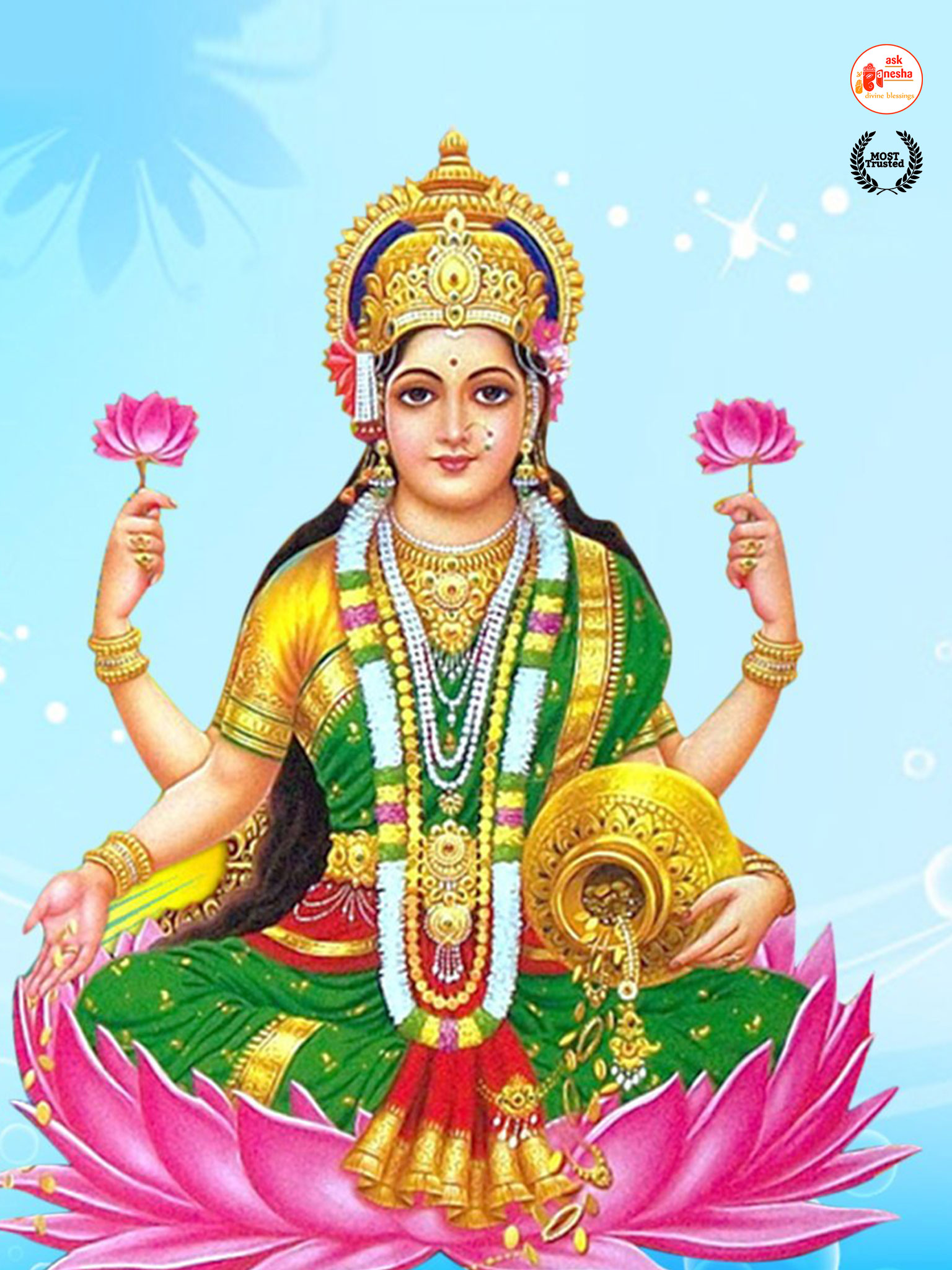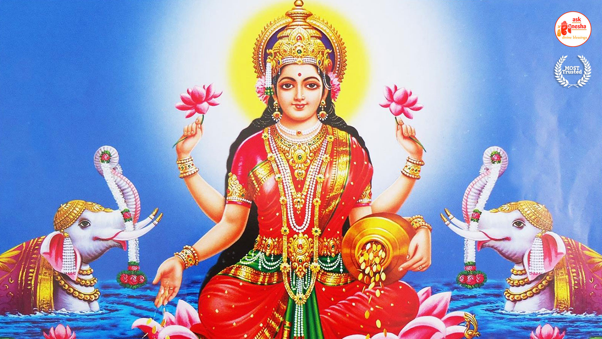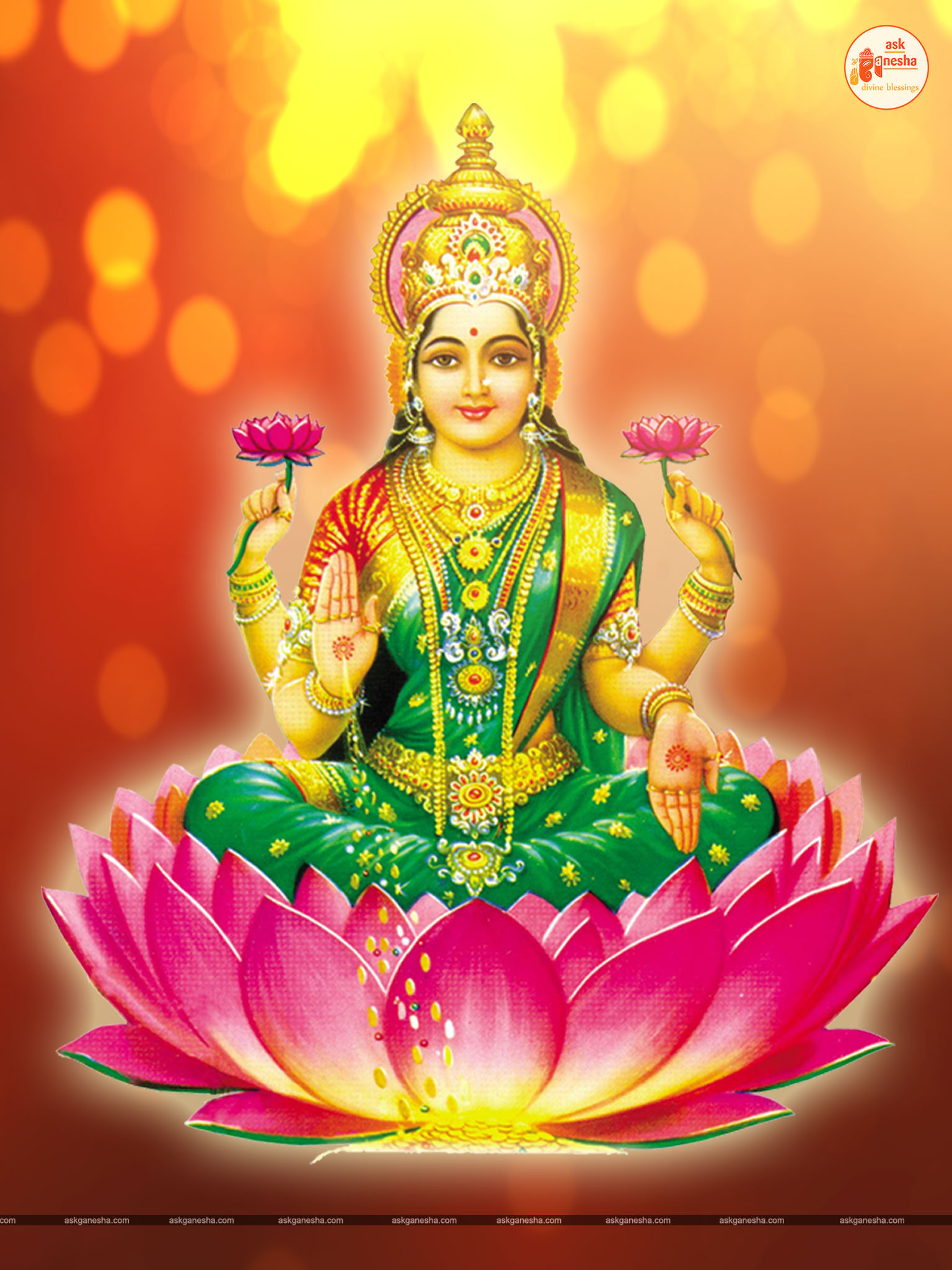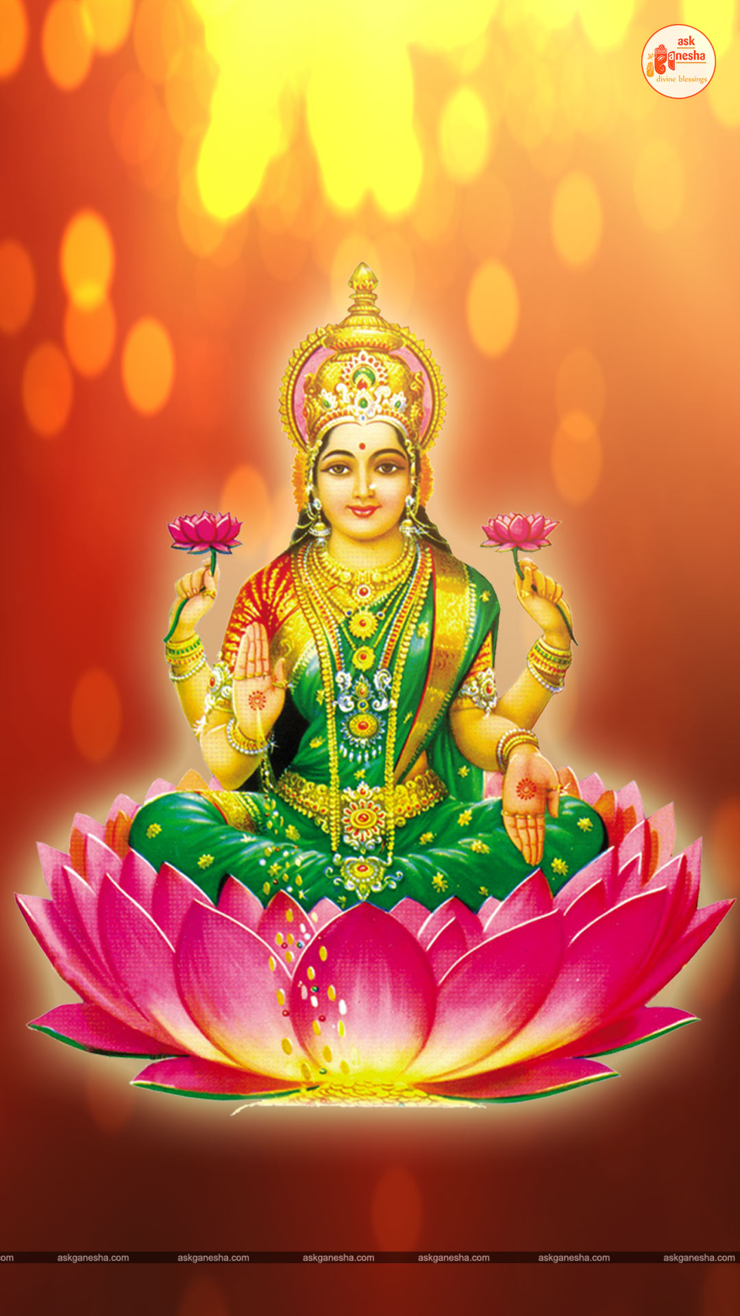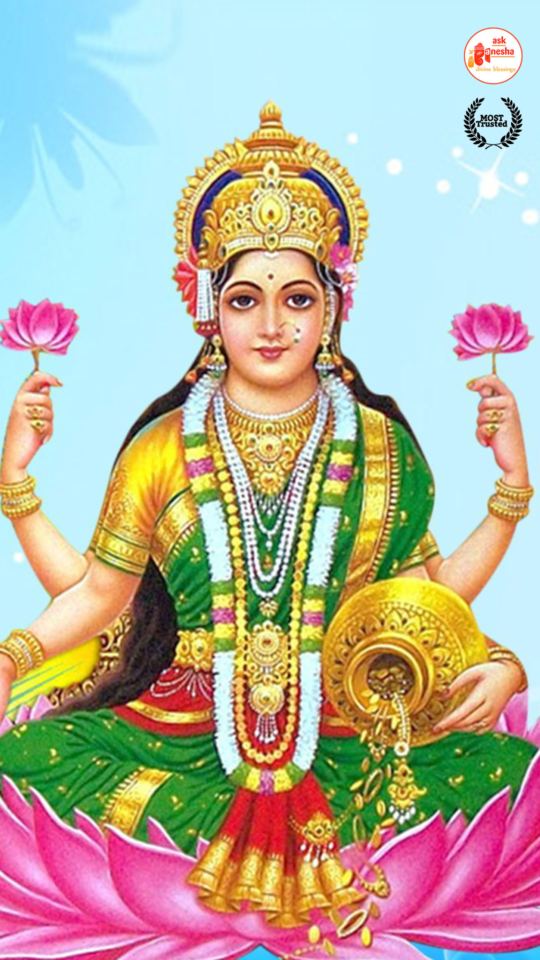 As Devi Lakshami holds a very important place in the life of the Hindus, Askganesha has come up with some special remedial wallpapers of goddess Lakshami to be installed on electronic gadgets like laptops or mobiles or P.C etc. These wallpapers show Goddess Lakshami in her most common generous prosperity showering aspect. You can download these wallpapers free of cost on your electronic devices.