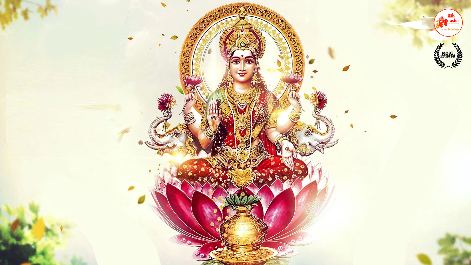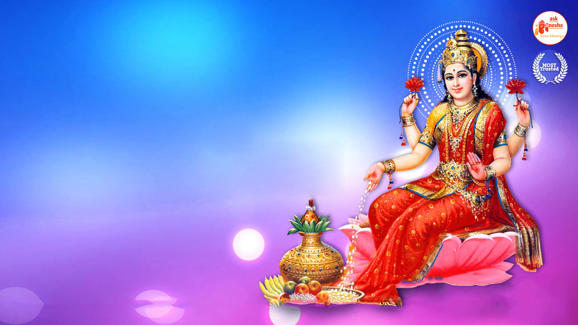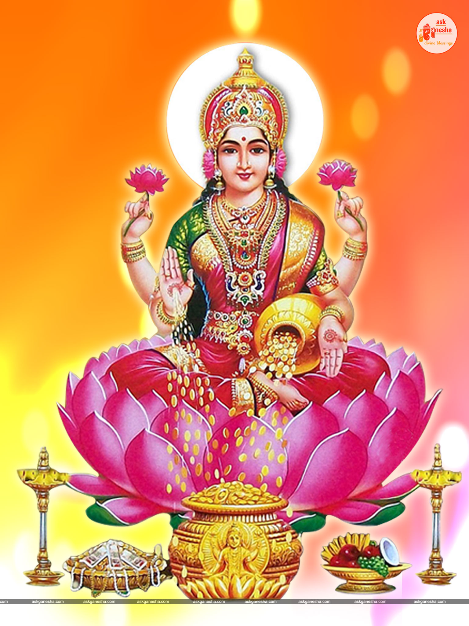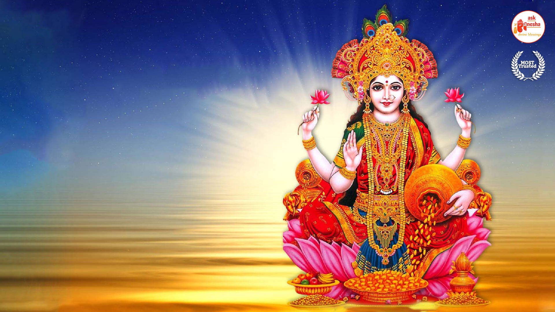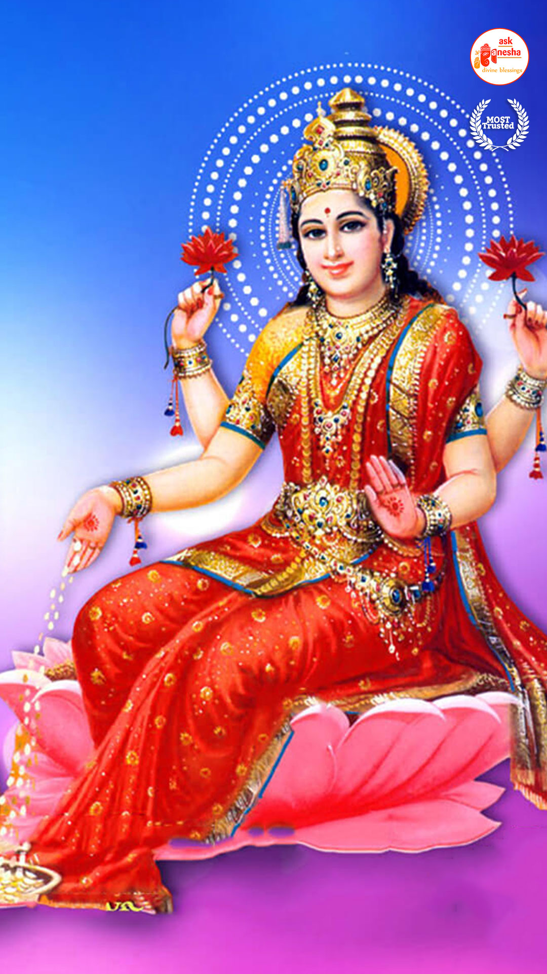 As Devi Lakshami holds a very important place in the life of the Hindus, Askganesha has come up with some special remedial wallpapers of goddess Lakshami to be installed on electronic gadgets like laptops or mobiles or P.C etc. These wallpapers show Goddess Lakshami in her most common generous prosperity showering aspect. You can download these wallpapers free of cost on your electronic devices.