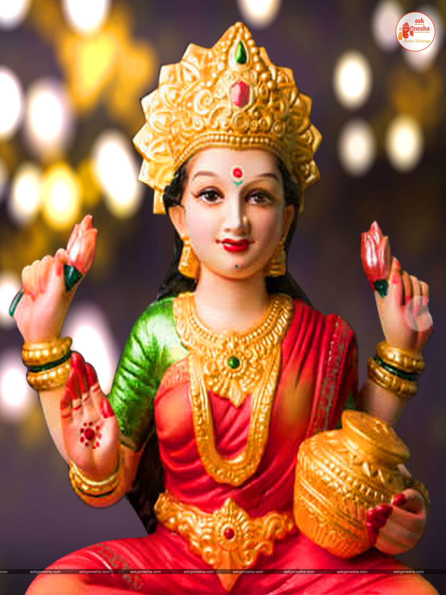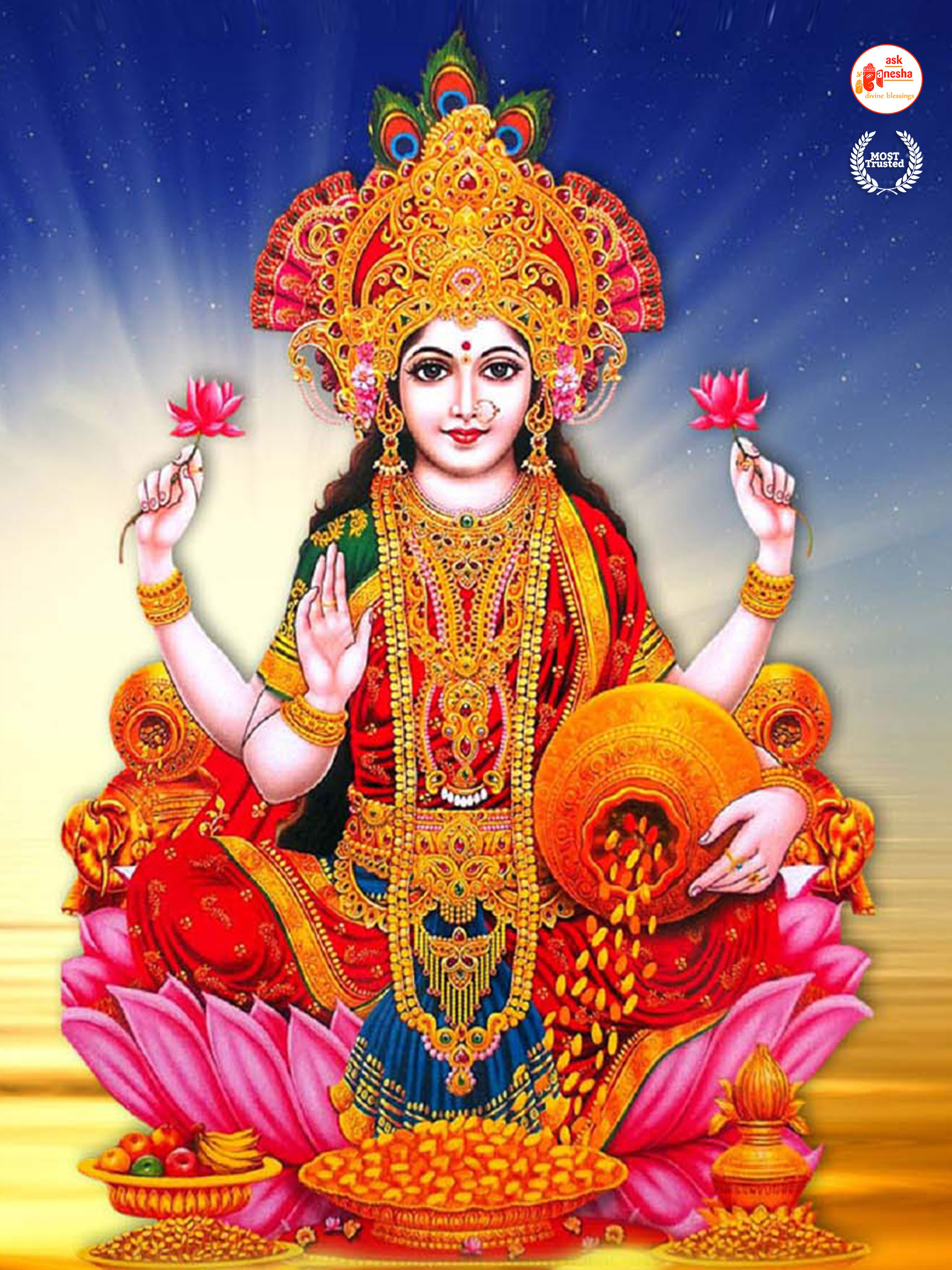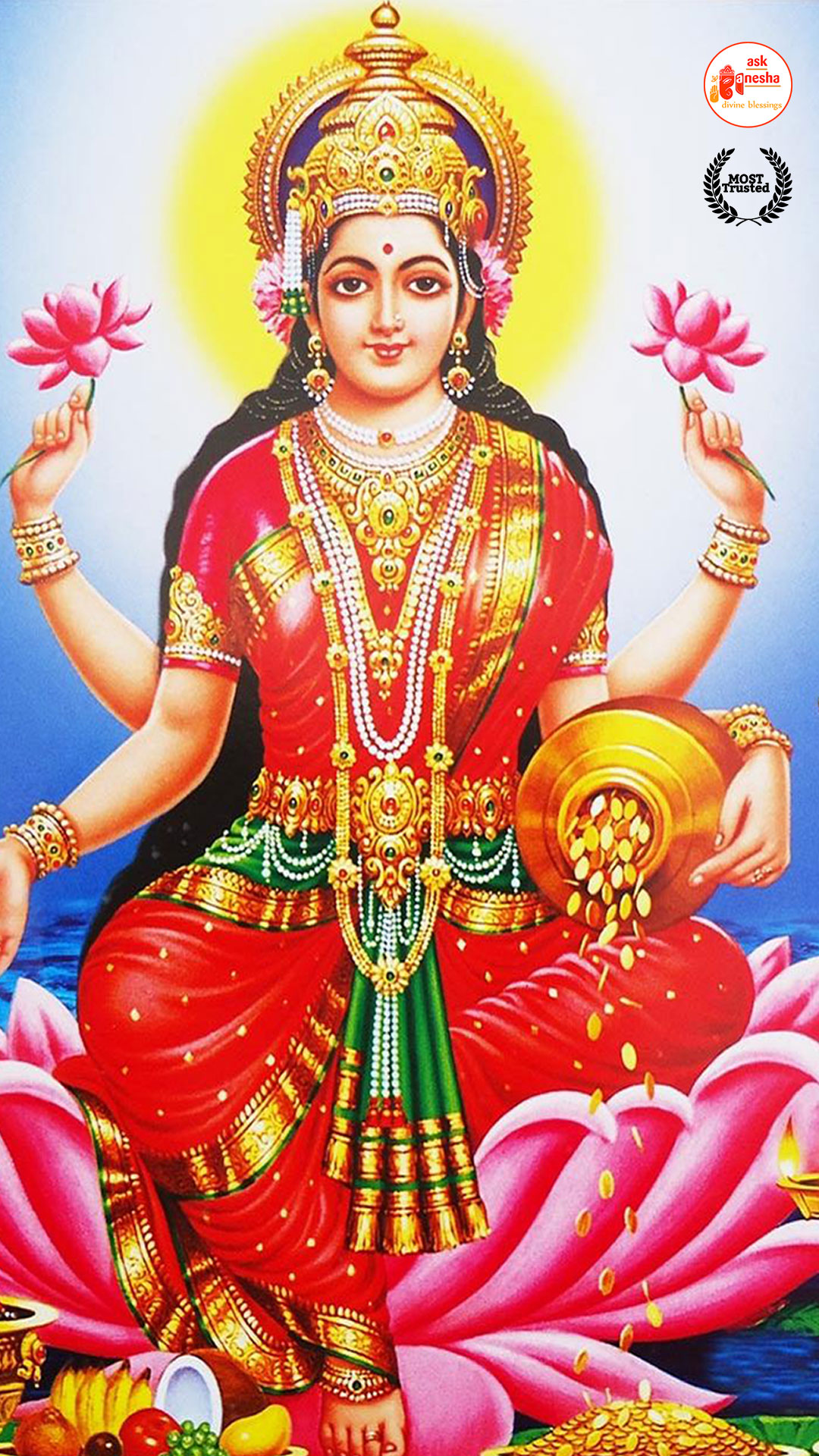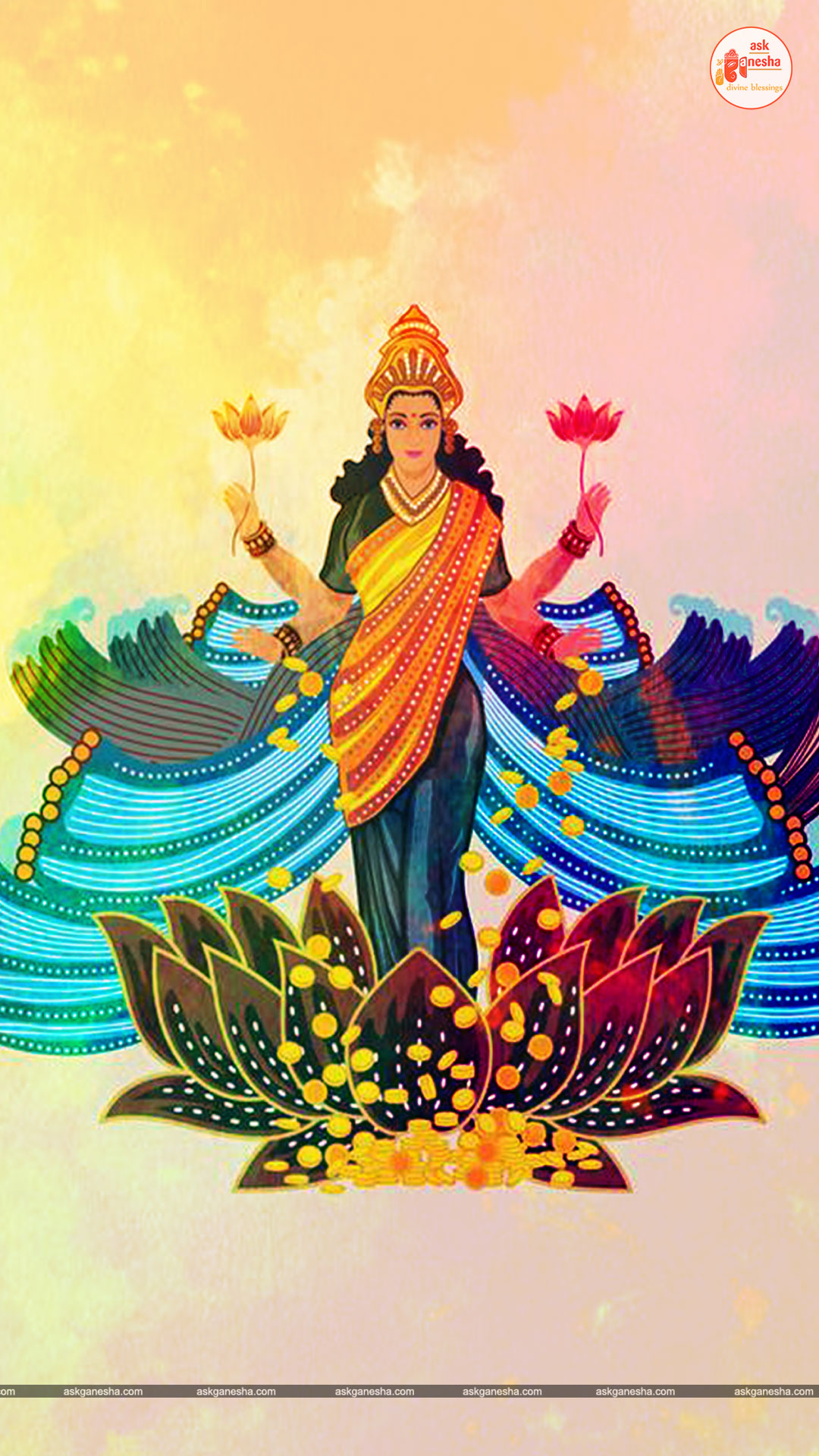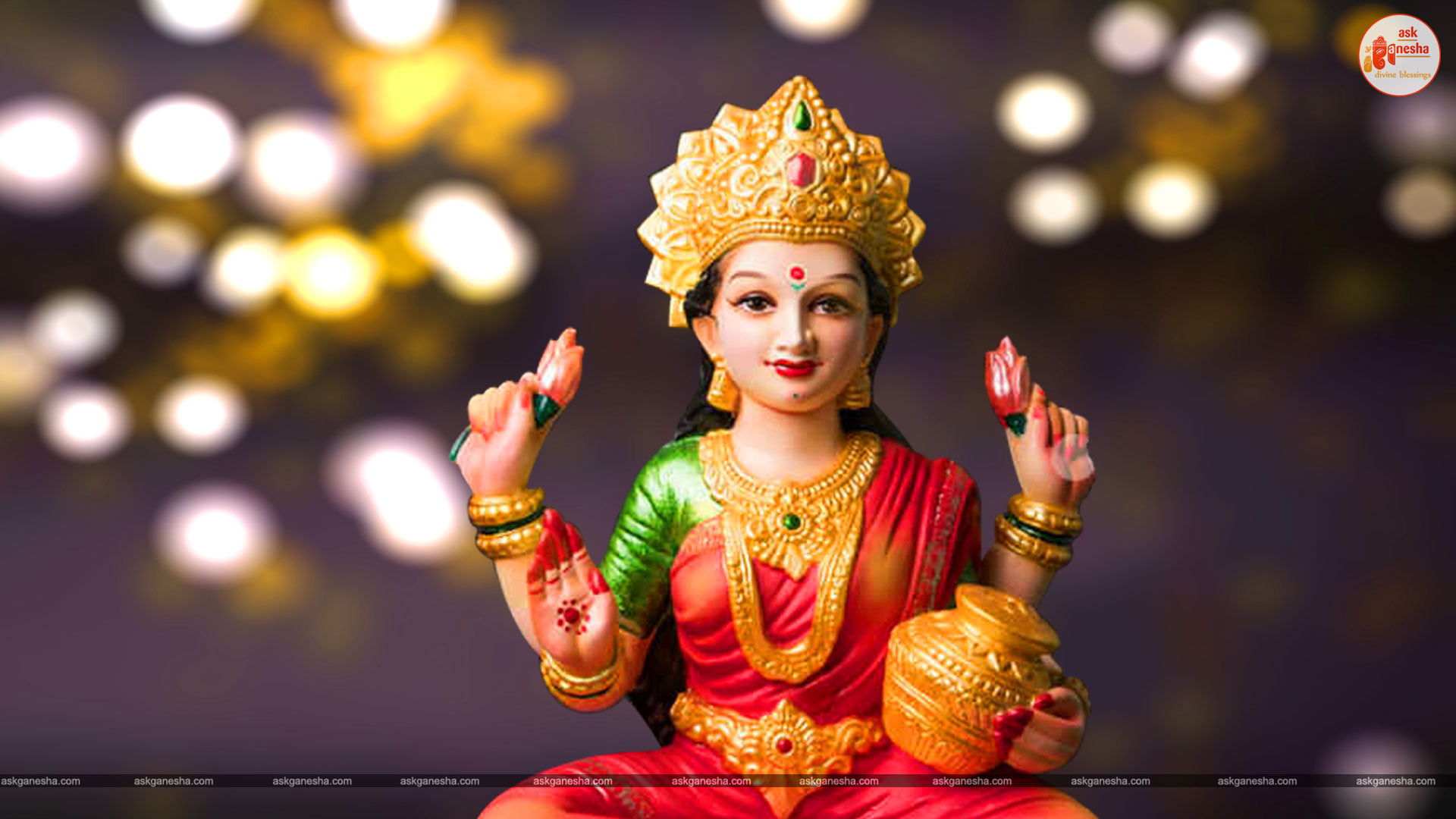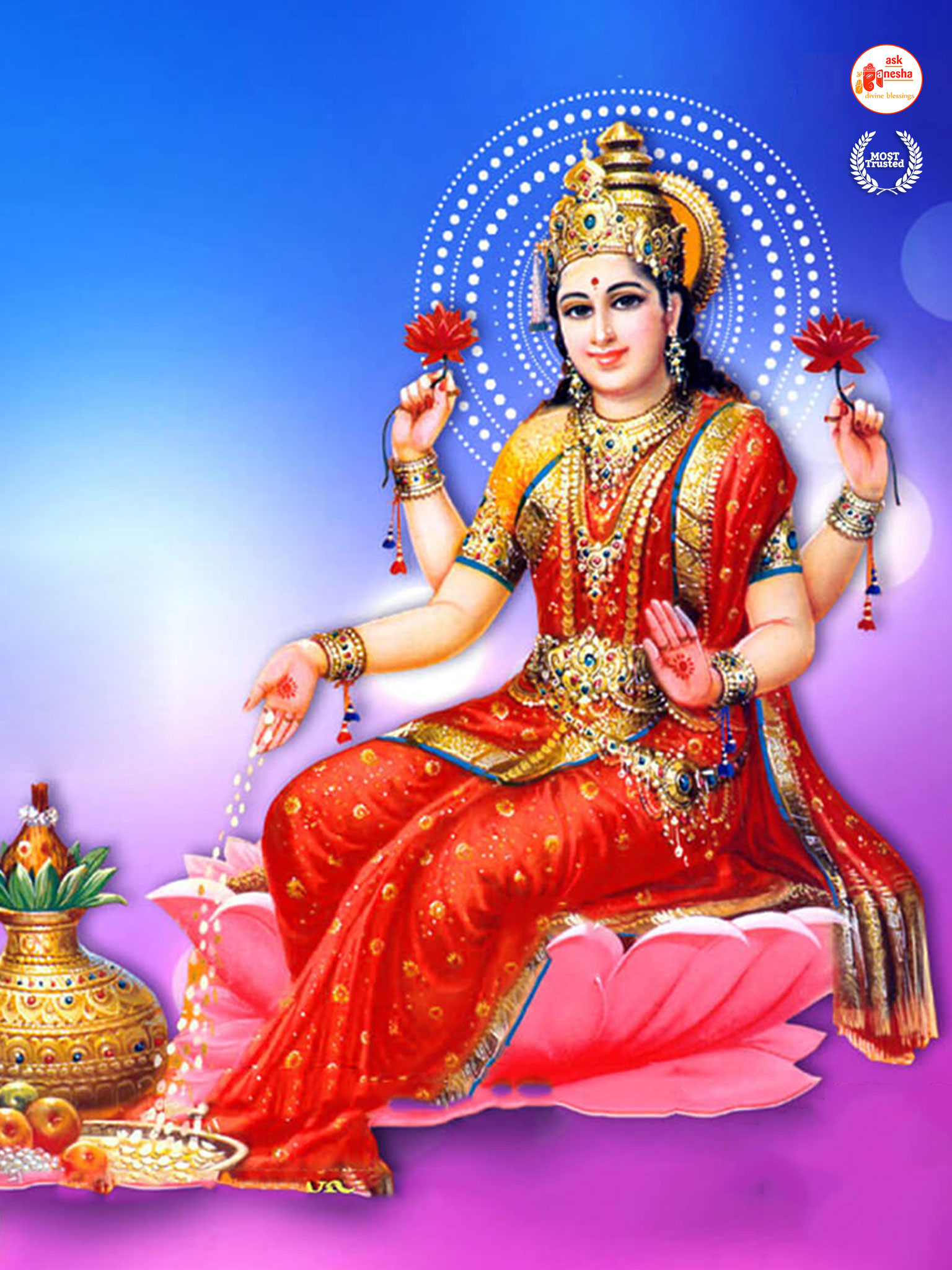As Devi Lakshami holds a very important place in the life of the Hindus, Askganesha has come up with some special remedial wallpapers of goddess Lakshami to be installed on electronic gadgets like laptops or mobiles or P.C etc. These wallpapers show Goddess Lakshami in her most common generous prosperity showering aspect. You can download these wallpapers free of cost on your electronic devices.