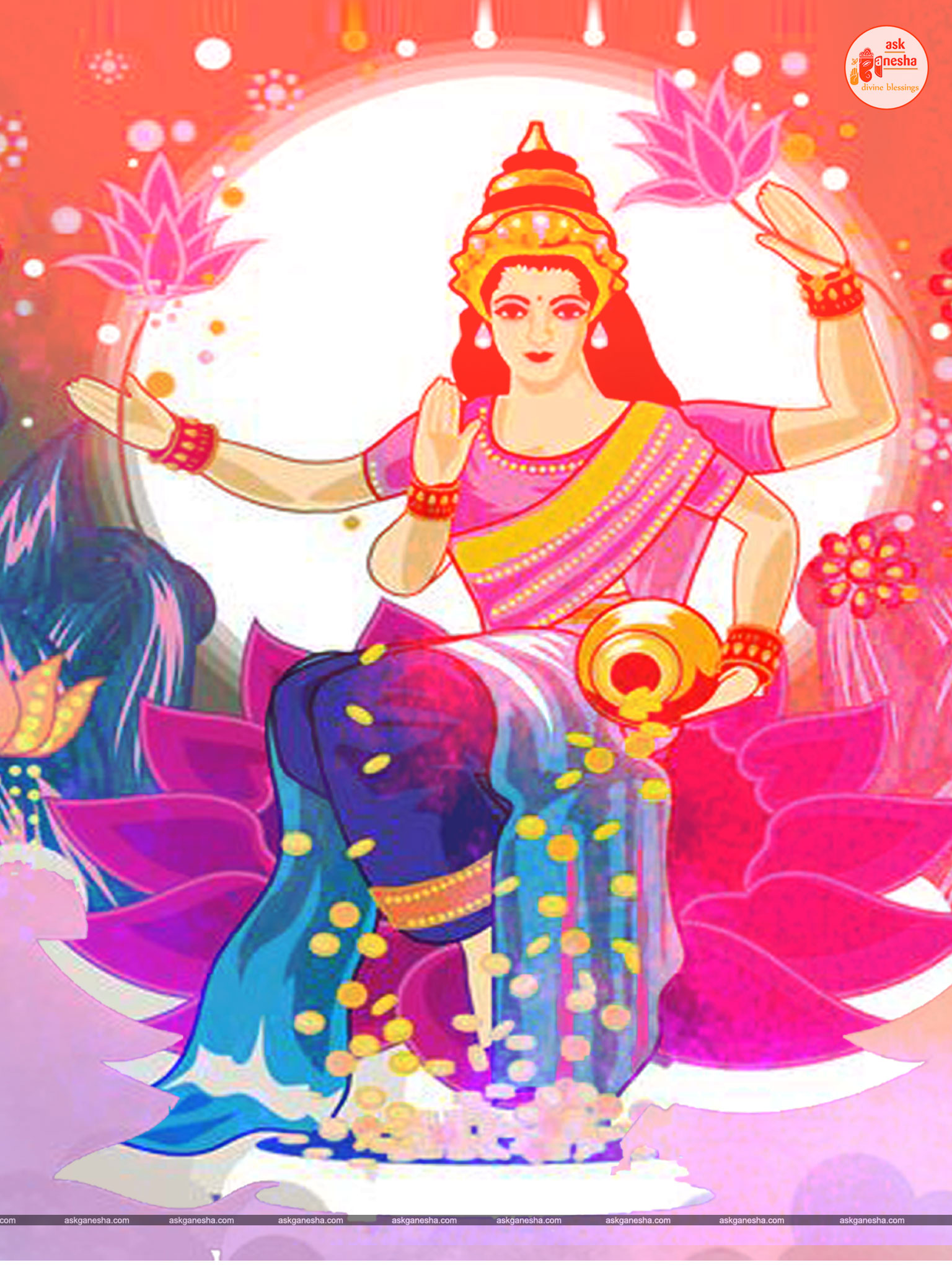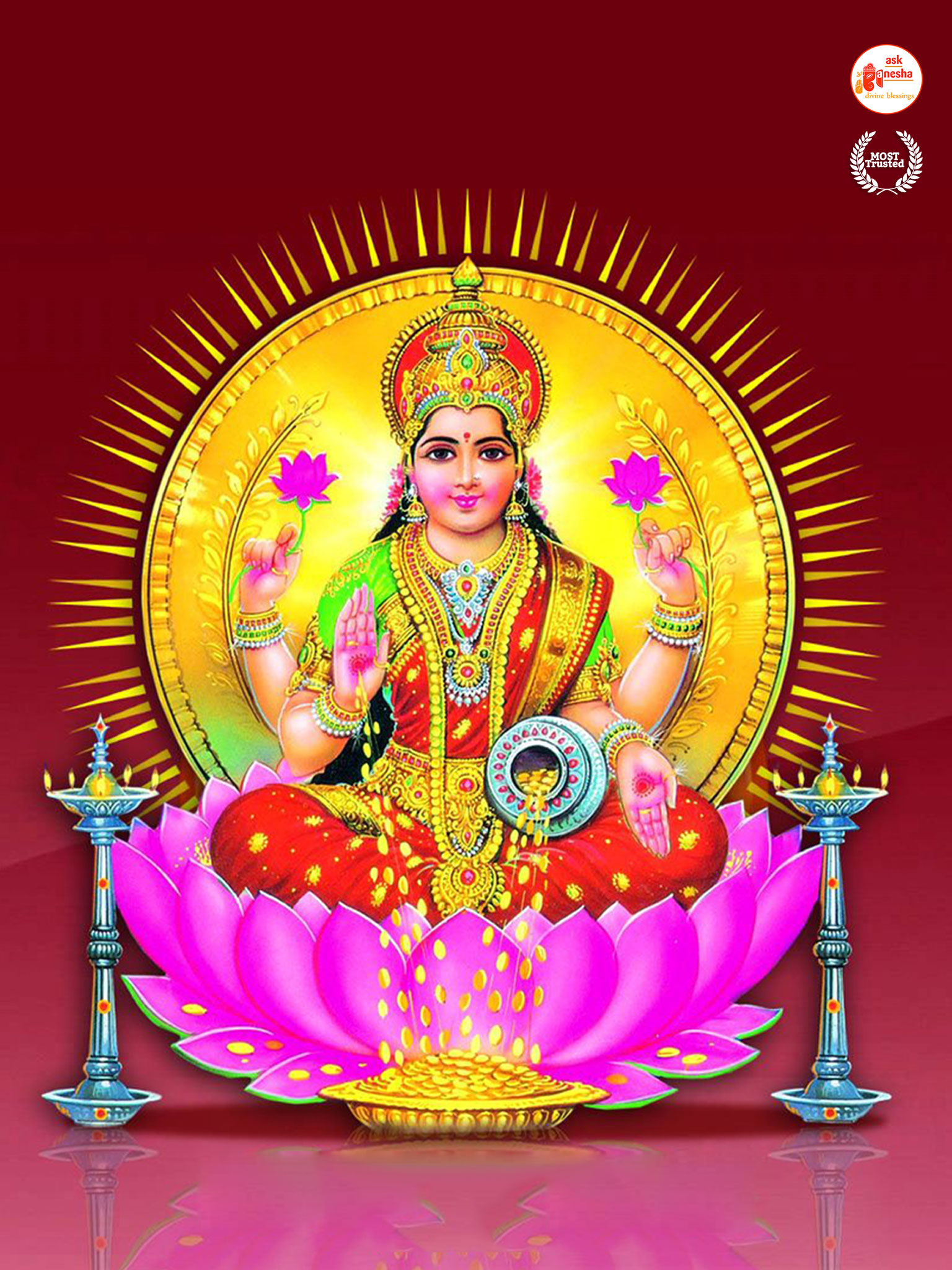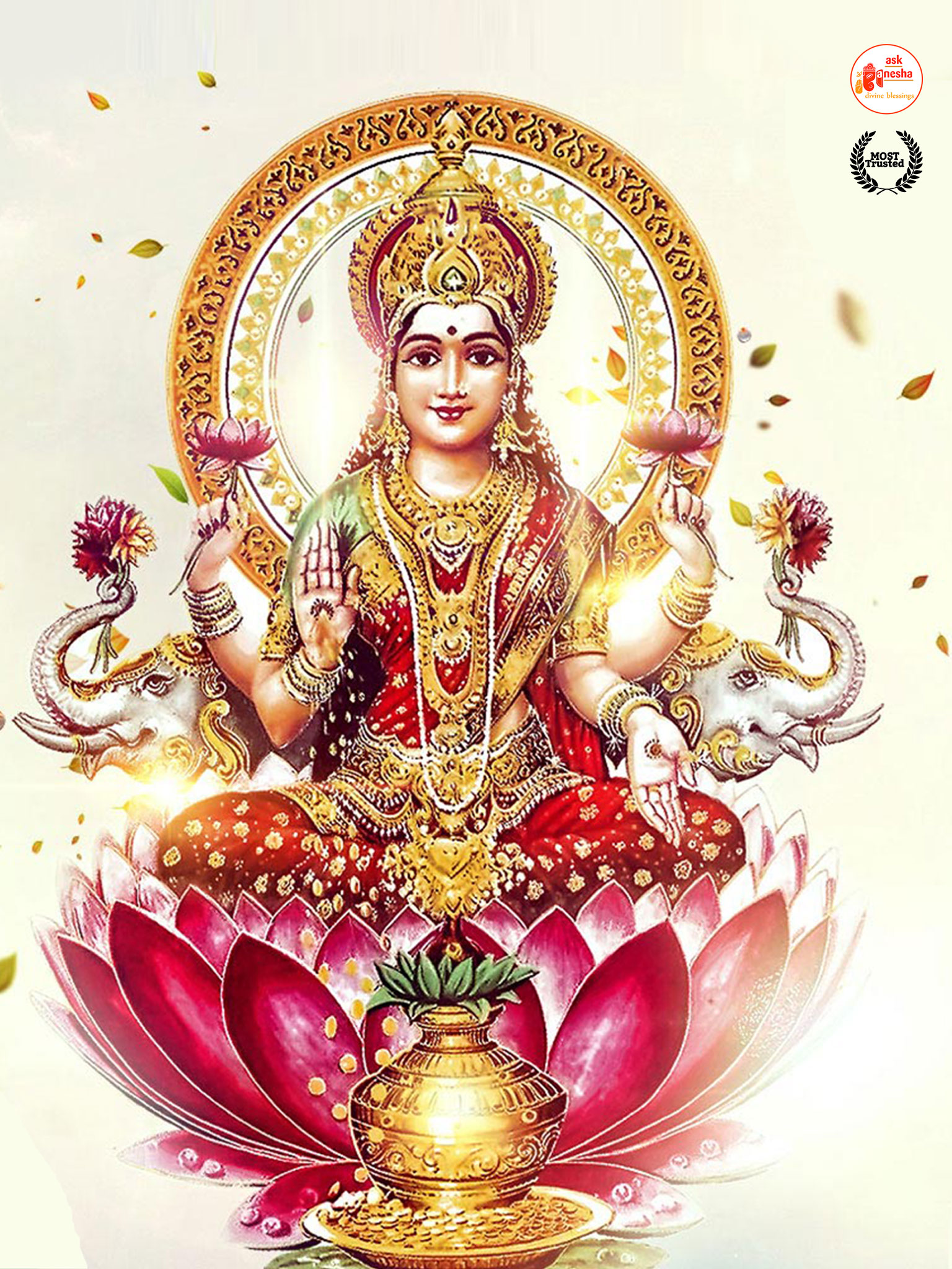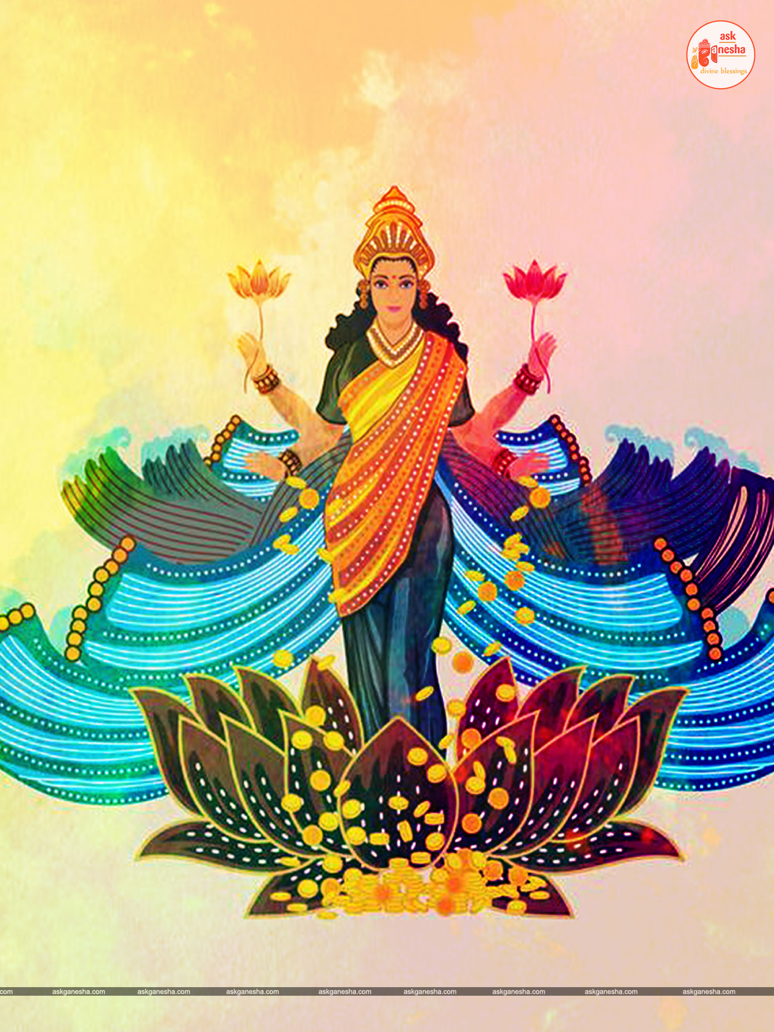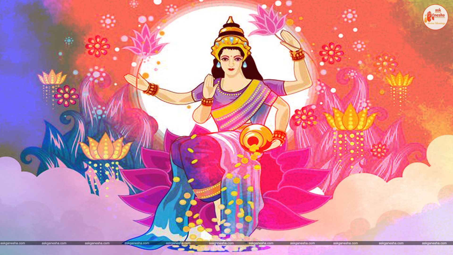 As Devi Lakshami holds a very important place in the life of the Hindus, Askganesha has come up with some special remedial wallpapers of goddess Lakshami to be installed on electronic gadgets like laptops or mobiles or P.C etc. These wallpapers show Goddess Lakshami in her most common generous prosperity showering aspect. You can download these wallpapers free of cost on your electronic devices.